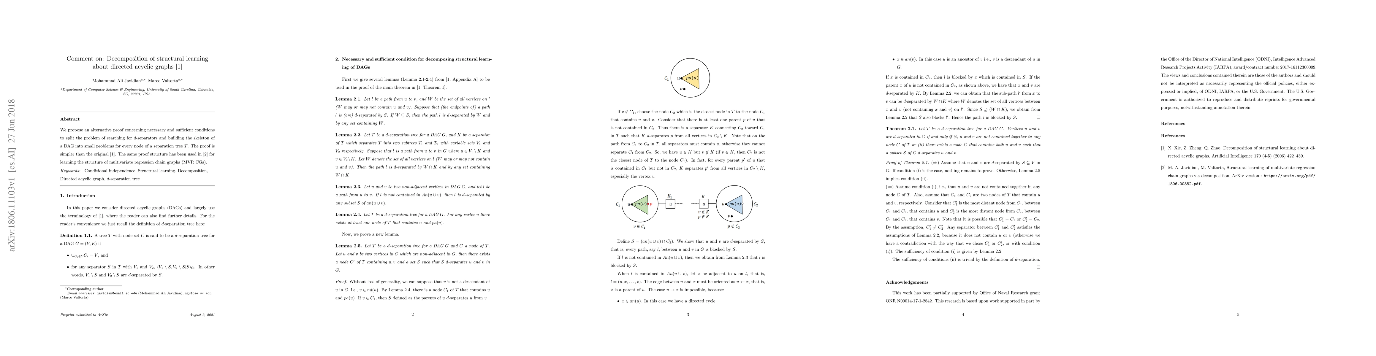 We propose an alternative proof concerning necessary and sufficient conditions to split the problem of searching for d-separators and building the skeleton of a DAG into small problems for every node of a separation tree T. The proof is simpler than the original [1]. The same proof structure has been used in [2] for learning the structure of multivariate regression chain graphs (MVR CGs).