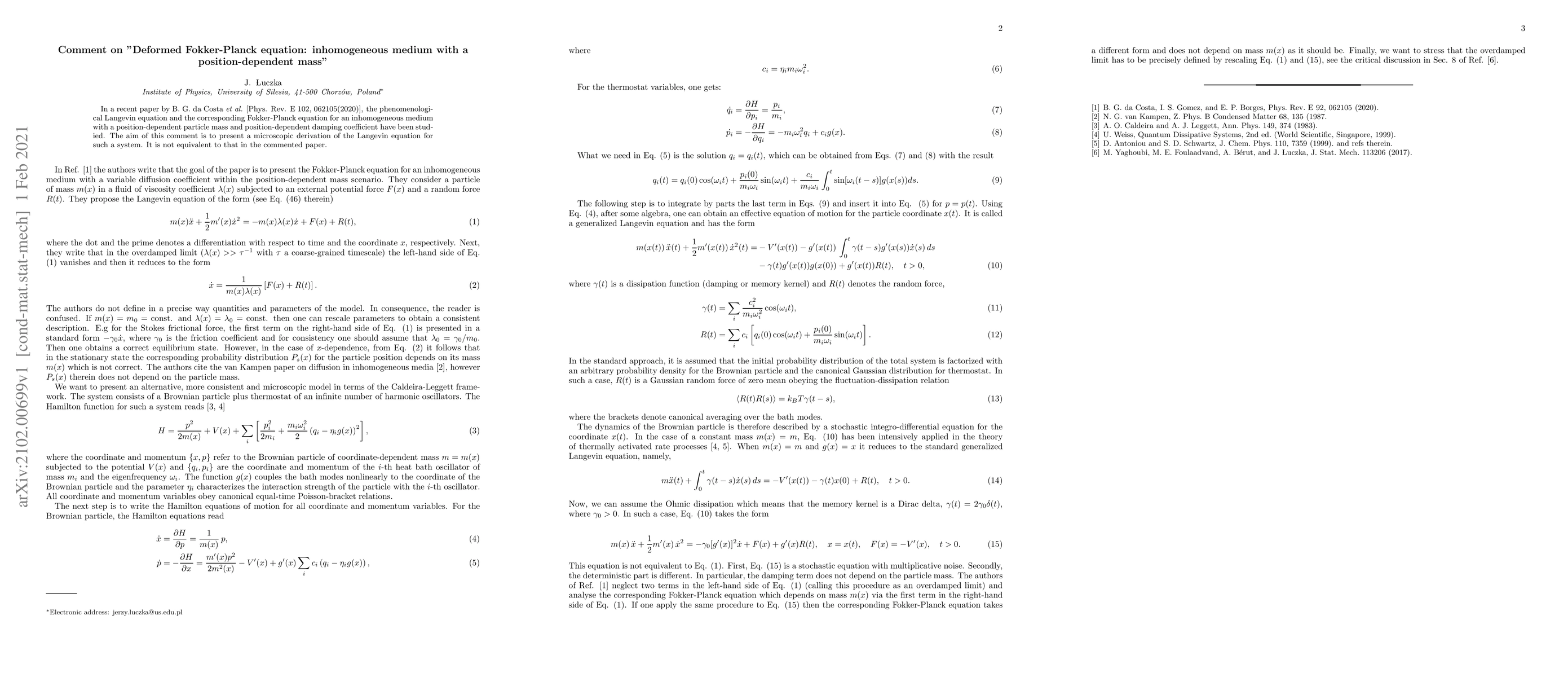 In a recent paper by B. G. da Costa {\it et al.} [Phys. Rev. E 102, 062105(2020)], the phenomenological Langevin equation and the corresponding Fokker-Planck equation for an inhomogeneous medium with a position-dependent particle mass and position-dependent damping coefficient have been studied. The aim of this comment is to present a microscopic derivation of the Langevin equation for such a system. It is not equivalent to that in the commented paper.