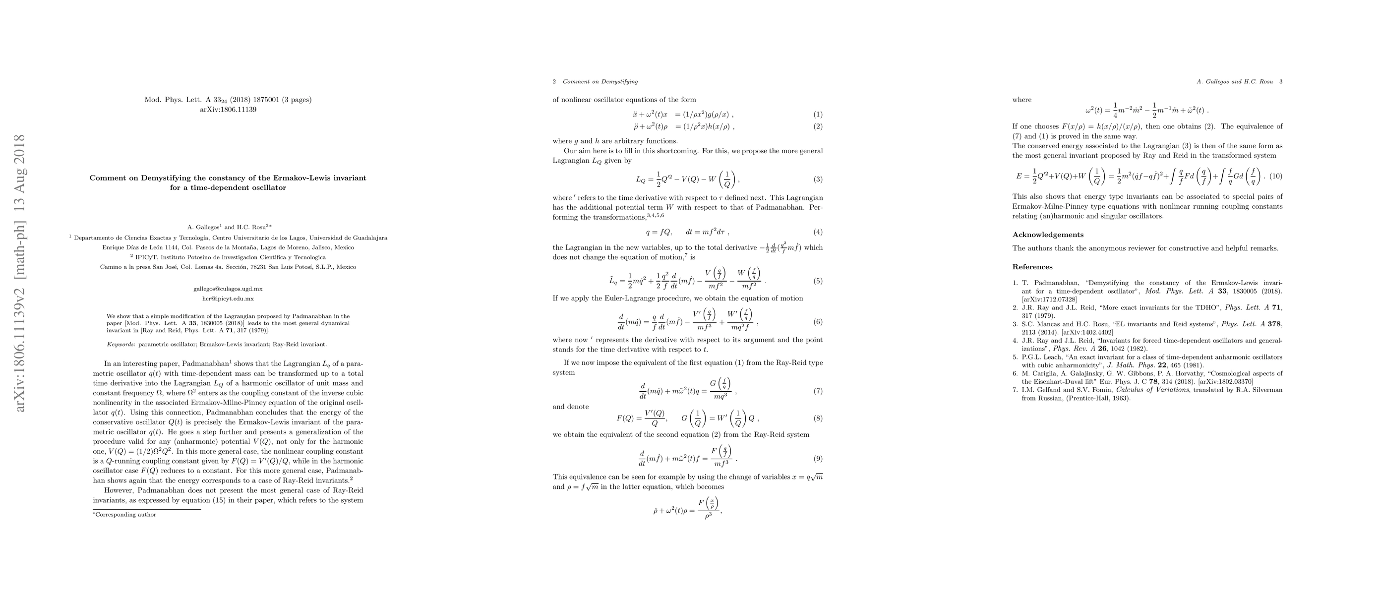 We show that a simple modification of the Lagrangian proposed by Padmanabhan in the paper [Mod. Phys. Lett. A 33, 1830005 (2018), arXiv:1712.07328] leads to the most general dynamical invariant in [Ray and Reid, Phys. Lett. A 71, 317 (1979)]