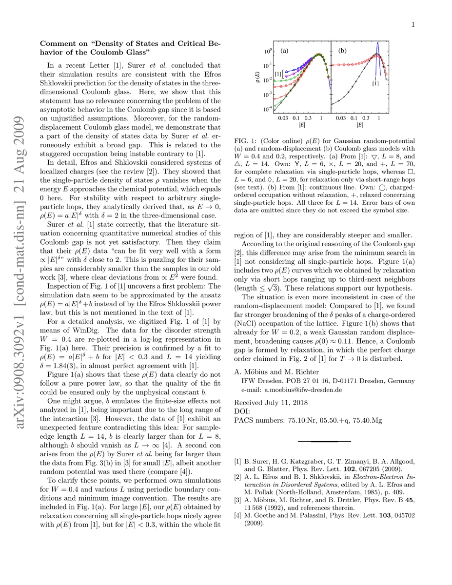 In a recent numerical investigation of the Coulomb glass, Surer et al. [Phys. Rev. Lett. 102, 067205 (2009)] concluded that their simulation results are consistent with the Efros Shklovskii prediction for the density of states in the three-dimensional case. Here, we show that this statement has no relevance concerning the problem of the asymptotic behavior in the Coulomb gap since it is based on unjustified assumptions. Moreover, for the random-displacement Coulomb glass model, we demonstrate that a part of the density of states data by Surer et al. erroneously exhibit a broad gap. This is related to the staggered occupation being instable contrary to their findings.