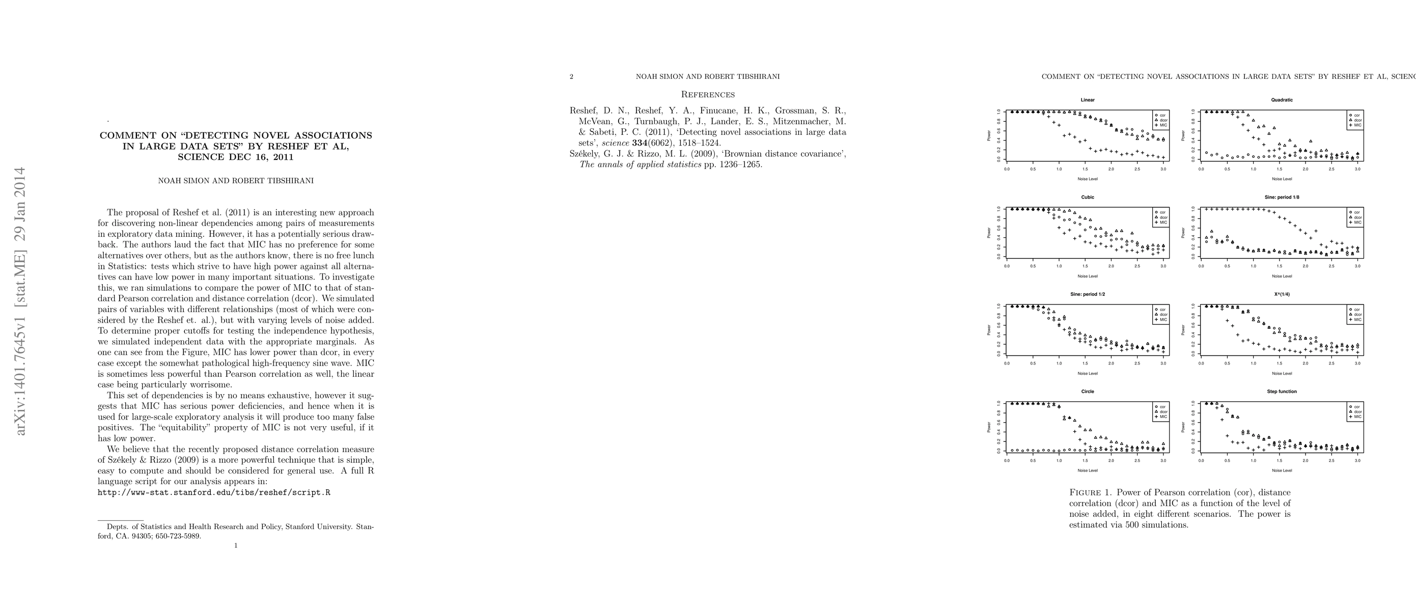 The proposal of Reshef et al. (2011) is an interesting new approach for discovering non-linear dependencies among pairs of measurements in exploratory data mining. However, it has a potentially serious drawback. The authors laud the fact that MIC has no preference for some alternatives over others, but as the authors know, there is no free lunch in Statistics: tests which strive to have high power against all alternatives can have low power in many important situations. To investigate this, we ran simulations to compare the power of MIC to that of standard Pearson correlation and distance correlation (dcor). We simulated pairs of variables with different relationships (most of which were considered by the Reshef et. al.), but with varying levels of noise added. To determine proper cutoffs for testing the independence hypothesis, we simulated independent data with the appropriate marginals. As one can see from the Figure, MIC has lower power than dcor, in every case except the somewhat pathological high-frequency sine wave. MIC is sometimes less powerful than Pearson correlation as well, the linear case being particularly worrisome.