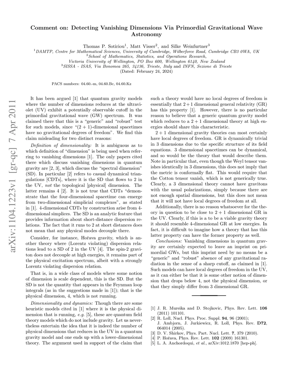 It has been recently claimed [arXiv:1102.3434] that quantum gravity models where the number of dimensions reduces at the ultraviolet exhibit a potentially observable cutoff in the primordial gravitational wave spectrum, and that this is a "generic" and "robust" test for such models, since "(2+1)-dimensional spacetimes have no gravitational degrees of freedom". We argue that such a claim is misleading.
