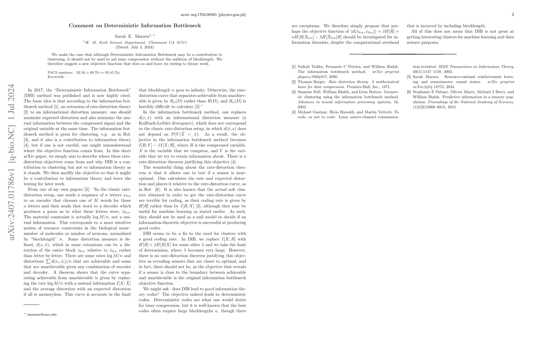 This paper argues that the Deterministic Information Bottleneck, while useful for clustering, is insufficient for lossy compression without incorporating blocklength. It proposes a new objective function to address this and suggests future testing of the new approach.