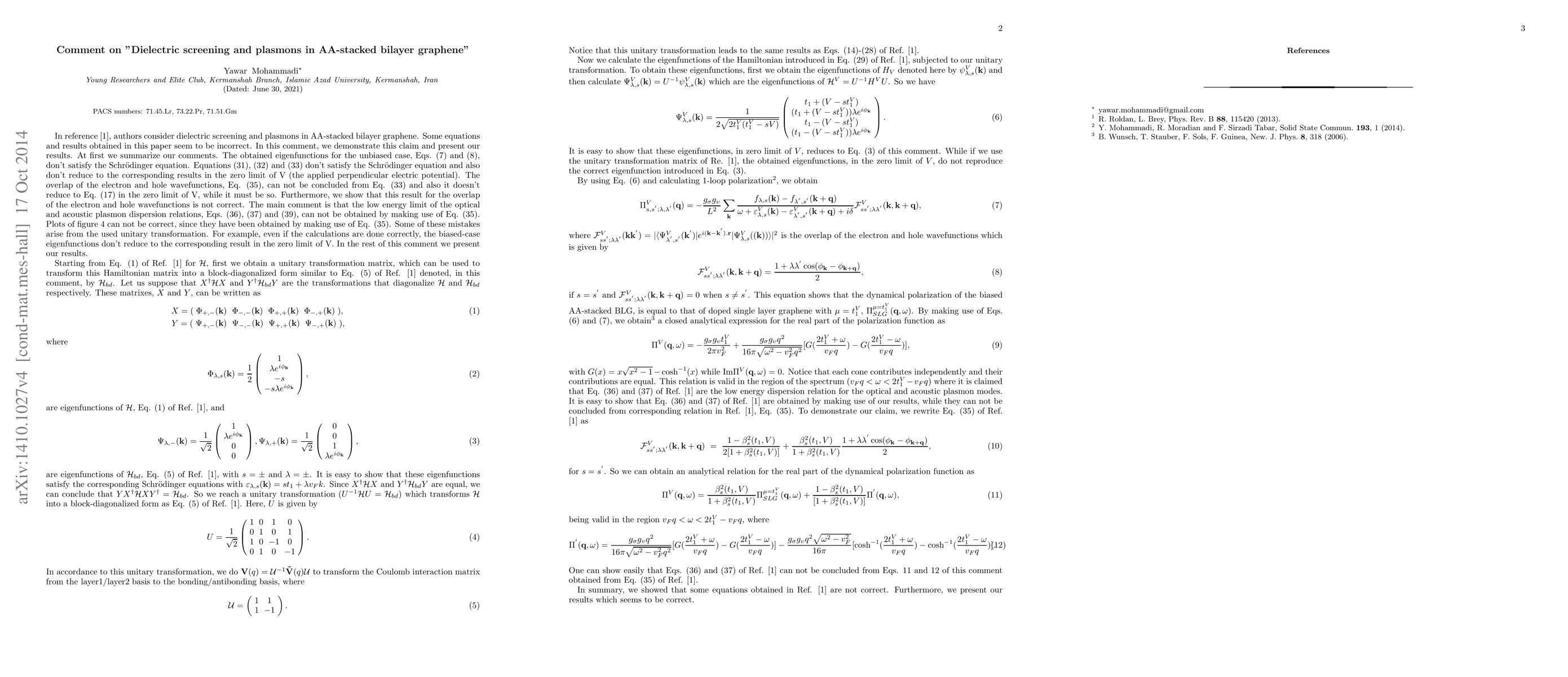 This comment identifies errors in the equations and findings of the original paper on "Dielectric screening and plasmons in AA-stacked bilayer graphene," and proposes more accurate results based on the author's own research.