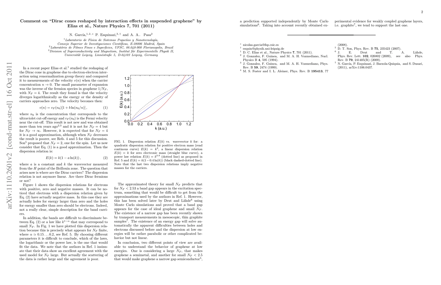 Two different points of view are available to understand the behavior of graphene at low energies. One is considering a large $N_F$ that makes graphene a semimetal, and another for small $N_F < 2.5$ that would make graphene a narrow gap semiconductor (D. T. Son, Phys. rev. B 75, 235423 (2007)), a prediction supported independently by Monte Carlo simulations (J. E. Drut and T. A. L\"ahde, Phys. Rev. Lett. 102, 026802 (2009), see also Phys. Rev. B 79, 241405(R) (2009)). Taking into account recently obtained experimental evidence for weakly coupled graphene layers, i.e. graphite (N. Garc\'ia et al., arXiv/1106.0437), we tend to support the last one.