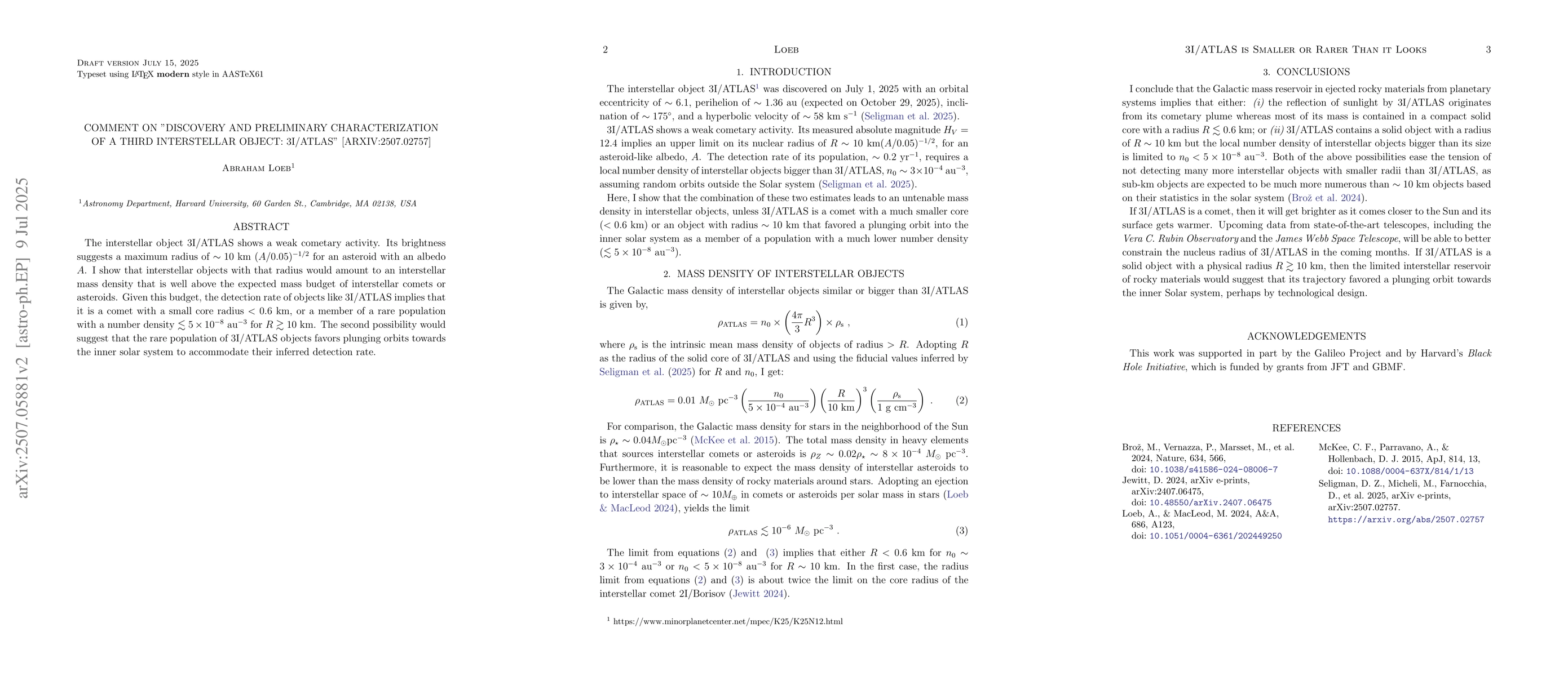 The interstellar object 3I/ATLAS shows a weak cometary activity. Its brightness suggests a maximum radius of ~10km (A/0.05)^{-1/2} for an asteroid with an albedo A. I show that interstellar objects with that radius would amount to an interstellar mass density that is well above the expected mass budget of interstellar comets or asteroids. Given this budget, the detection rate of objects like 3I/ATLAS implies that it is a comet with a small core radius <0.6km, or a member of a rare population with a number density <5x10^{-8}au^{-3} for R>10km. The second possibility would suggest that the rare population of 3I/ATLAS objects favors plunging orbits towards the inner solar system to accommodate their inferred detection rate.