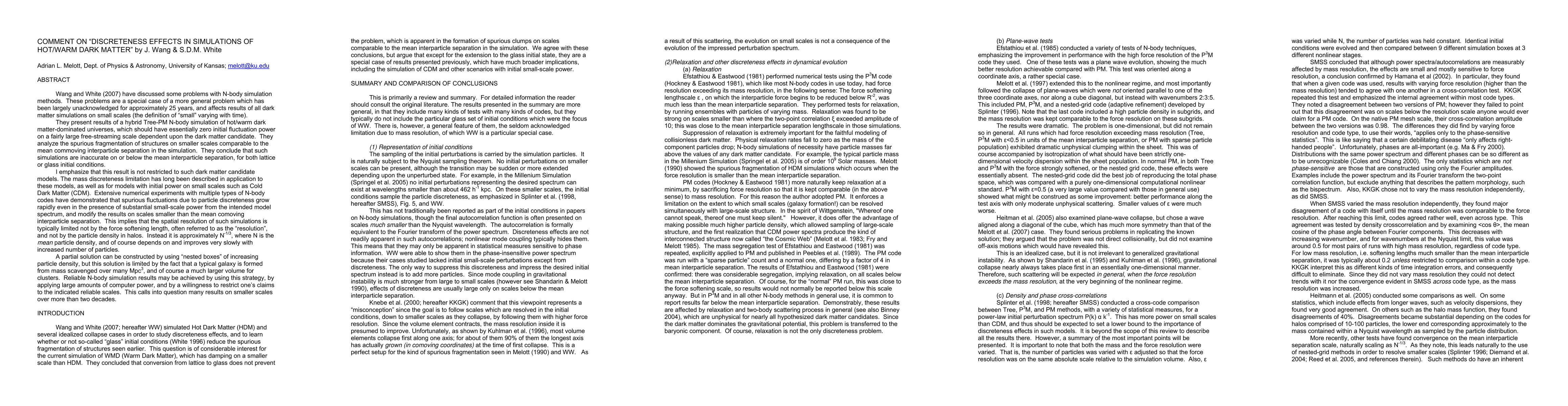 Wang and White (2007) have discussed some problems with N-body simulation methods. These problems are a special case of a more general problem which has been largely unacknowledged for approximately 25 years, and affects results of all dark matter simulations on small scales (the definition of 'small' varying with time). Extensive numerical experiments with multiple types of N-body codes have demonstrated that spurious fluctuations due to particle discreteness grow rapidly even in the presence of substantial small-scale power from the intended model spectrum, and modify the results on scales smaller than the mean comoving interparticle separation. This implies that the spatial resolution of such simulations is typically limited not by the force softening length, often referred to as the 'resolution', and not by the particle density in halos. Instead it is approximately N^-1/3, where N is the mean particle density, and of course depends on and improves very slowly with increased number of particles. This calls into question many results on smaller scales over more than two decades.