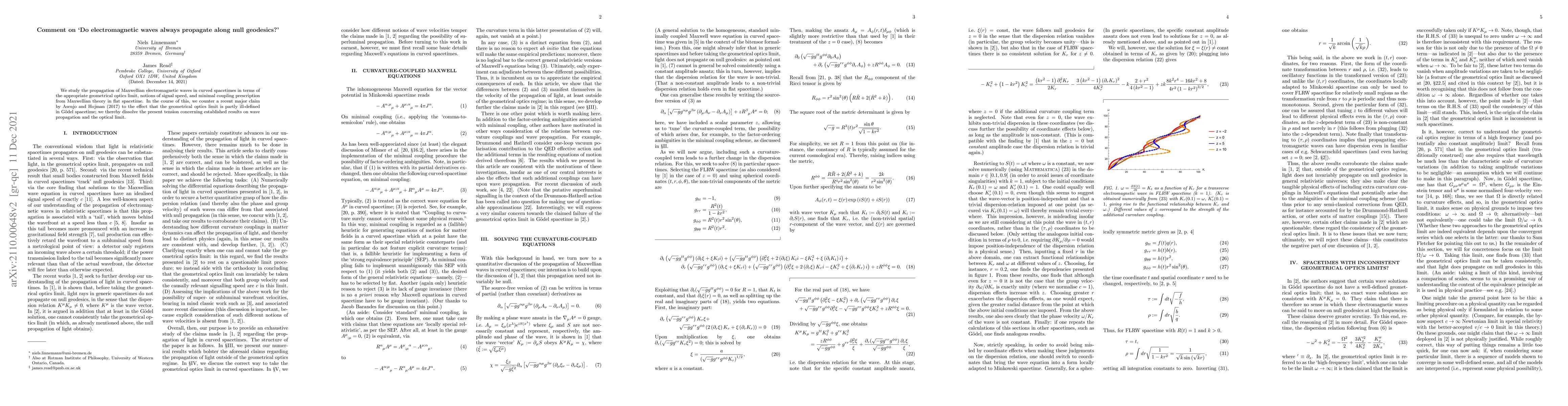 We study the propagation of Maxwellian electromagnetic waves in curved spacetimes in terms of the appropriate geometrical optics limit, notions of signal speed, and minimal coupling prescription from Maxwellian theory in flat spacetime. In the course of this, we counter a recent major claim by Asenjo and Hojman (2017) to the effect that the geometrical optics limit is partly ill-defined in G\"odel spacetime; we thereby dissolve the present tension concerning established results on wave propagation and the optical limit.