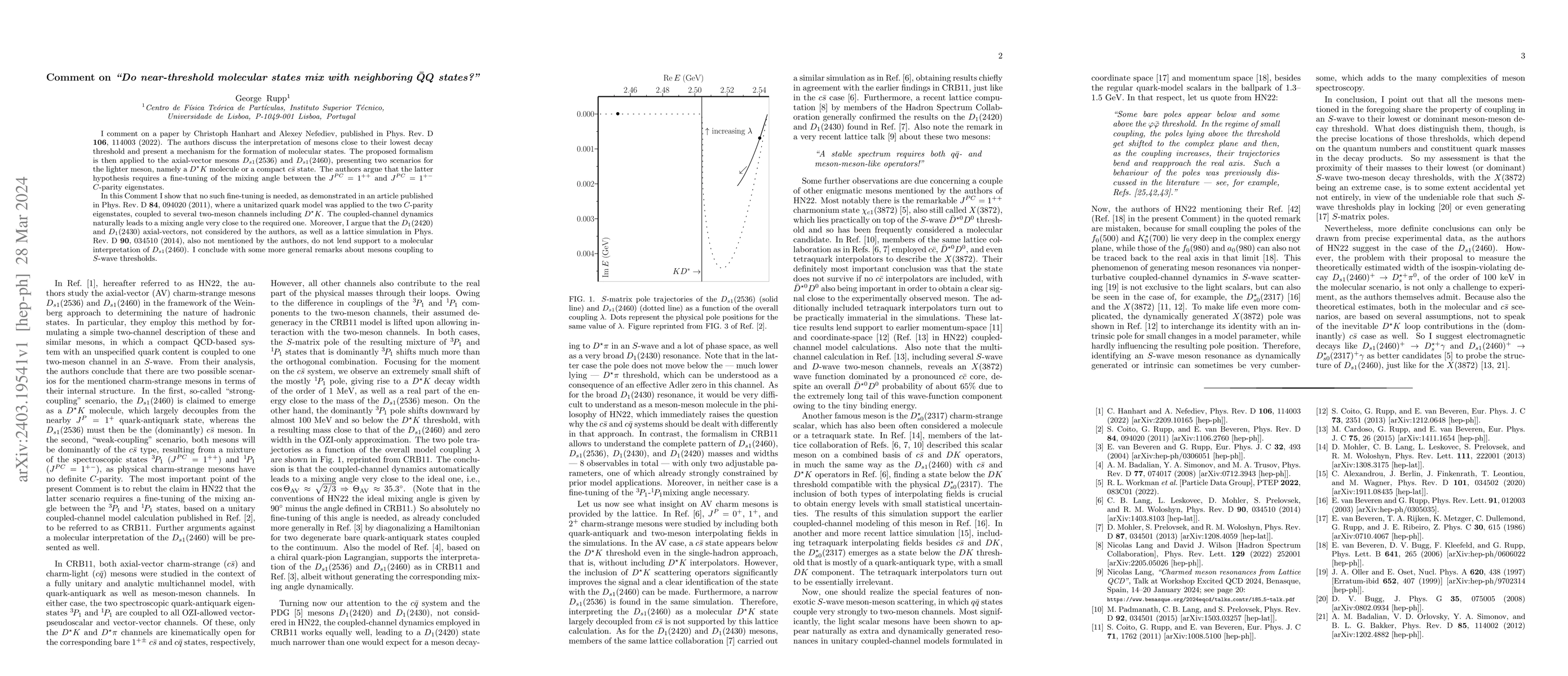 I comment on a paper by Christoph Hanhart and Alexey Nefediev, published in Phys. Rev. D 106, 114003 (2022). The authors discuss the interpretation of mesons close to their lowest decay threshold and present a mechanism for the formation of molecular states. The proposed formalism is then applied to the axial-vector mesons $D_{s1}(2536)$ and $D_{s1}(2460)$, presenting two scenarios for the lighter meson, namely a $D^\star K$ molecule or a compact $c\bar{s}$ state. The authors argue that the latter hypothesis requires a fine-tuning of the mixing angle between the $J^{PC}=1^{++}$ and $J^{PC}=1^{+-}$ $C$-parity eigenstates. In this Comment I show that no such fine-tuning is needed, as demonstrated in an article published in Phys. Rev. D 84, 094020 (2011), where a unitarized quark model was applied to the two $C$-parity eigenstates, coupled to several two-meson channels including $D^\star K$. The coupled-channel dynamics naturally leads to a mixing angle very close to the required one. Moreover, I argue that the $D_1(2420)$ and $D_1(2430)$ axial-vectors, not considered by the authors, as well as a lattice simulation in Phys. Rev. D 90, 034510 (2014), also not mentioned by the authors, do not lend support to a molecular interpretation of the $D_{s1}(2460)$. I conclude with some more general remarks about mesons coupling to $S$-wave thresholds.