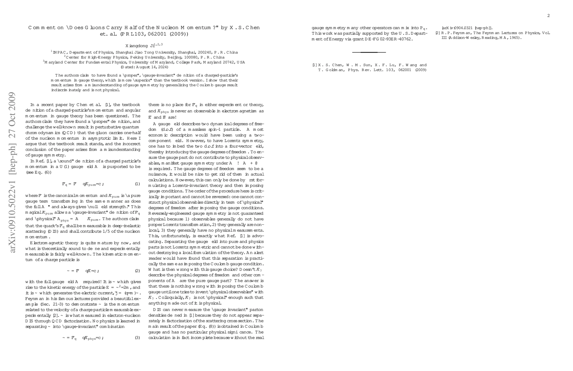 The authors claim to have found a "proper", "gauge-invariant" definition of a charged-particle's momentum in gauge theory, which is more "superior" than the textbook version. I show that their result arises from a misunderstanding of gauge symmetry by generalizing the Coulomb gauge result indiscriminately and is not physical.