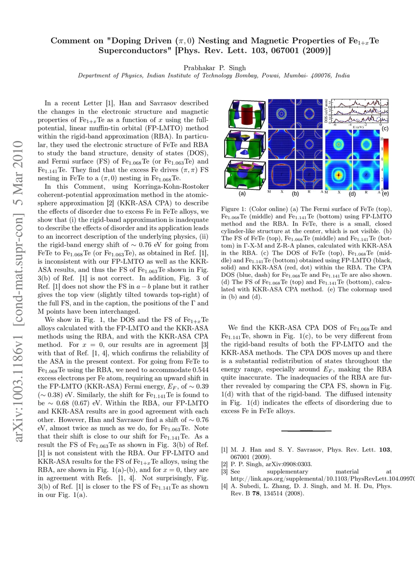 In this Comment, using Korringa-Kohn-Rostoker coherent-potential approximation method in the atomic-sphere approximation (KKR-ASA CPA) to describe the effects of disorder due to excess Fe in FeTe alloys, we show that (i) the rigid-band approximation is inadequate to describe the effects of disorder and its application leads to an incorrect description of the underlying physics, (ii) the rigid-band energy shift of ~0.76 eV for going from FeTe to Fe_{1.068}Te (or Fe_{1.063}Te), as obtained by Han and Savrasov (Phys. Rev. Lett. 103, 067001(2009)), is inconsistent with our FP-LMTO as well as the KKR-ASA results, and thus the FS of Fe_{1.063}Te shown in Fig. 3(b) of their paper is not correct.