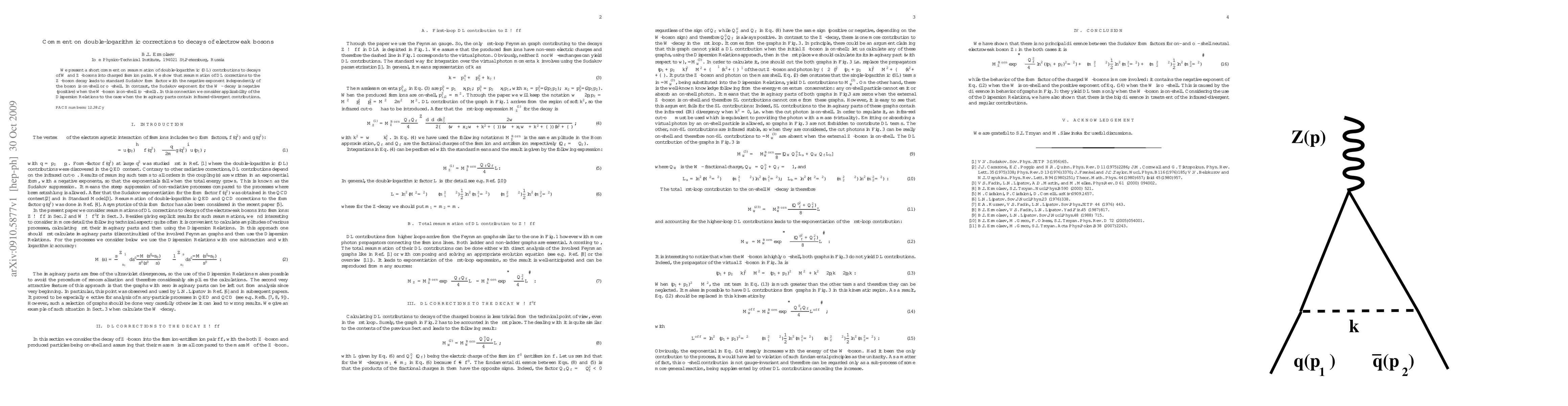 We present a short comment on resummation of double-logarithmic (DL) contributions to decays of W and Z -bosons into charged fermion pairs. We show that resummation of DL corrections to the Z -boson decay leads to standard Sudakov form factor with the negative exponent independently of the boson is on-shell or off-shell. In contrast, the Sudakov exponent for the W - decay is negative (positive) when the W-boson is on-shell (off-shell). In this connection we consider applicability of the Dispersion Relations to the case when the imaginary parts contain infrared-divergent contributions.