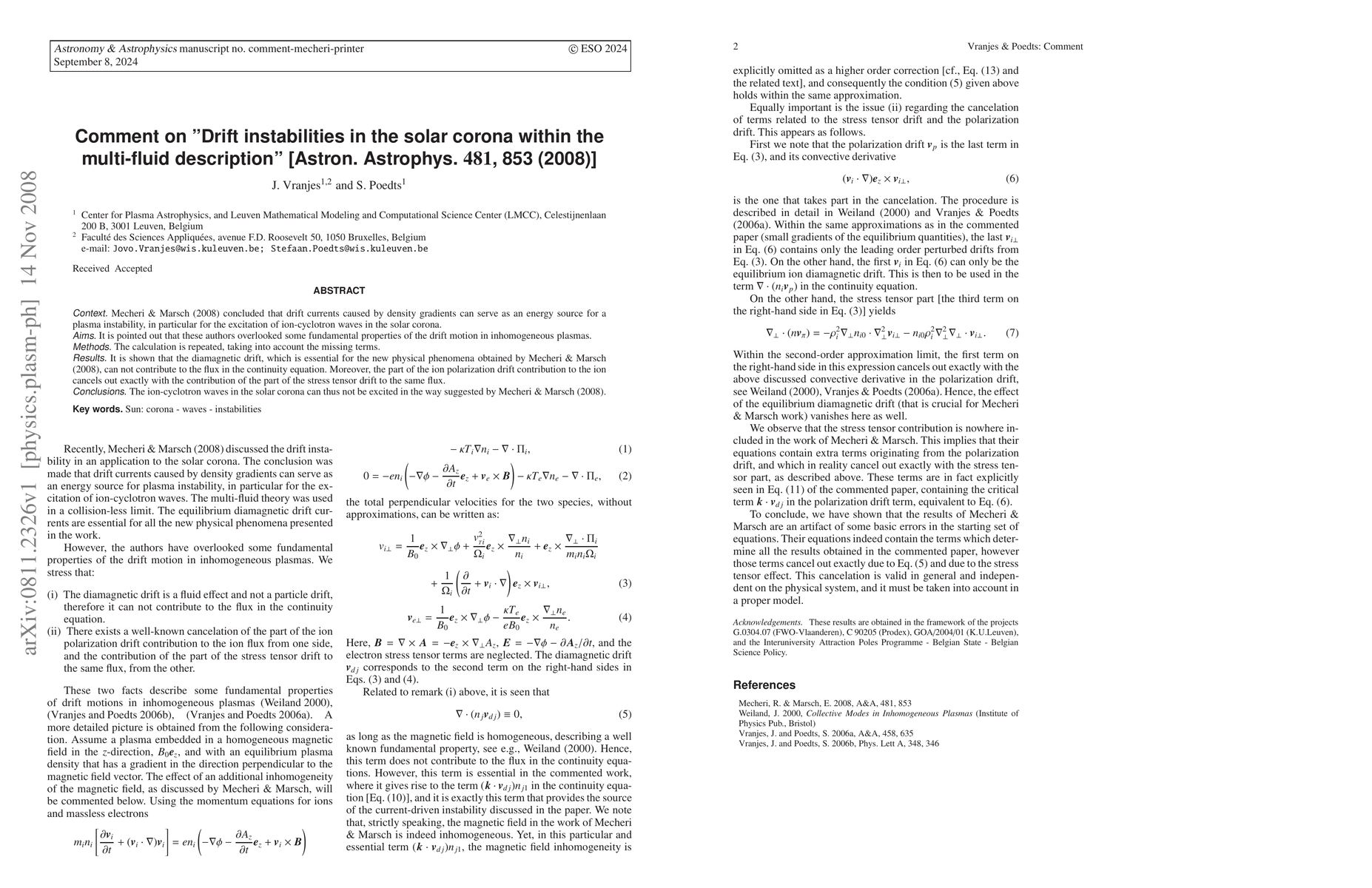 Mecheri and Marsch concluded that drift currents caused by density gradients can serve as an energy source for a plasma instability, in particular for the excitation of ion-cyclotron waves in the solar corona. It is pointed out that these authors overlooked some fundamental properties of the drift motion in inhomogeneous plasmas. The calculation is repeated, taking into account the missing terms. It is shown that the diamagnetic drift, which is essential for the new physical phenomena obtained by Mecheri and Marsch, can not contribute to the flux in the continuity equation. Moreover, the part of the ion polarization drift contribution to the ion cancels out exactly with the contribution of the part of the stress tensor drift to the same flux. The ion-cyclotron waves in the solar corona can thus not be excited in the way suggested by Mecheri and Marsch.