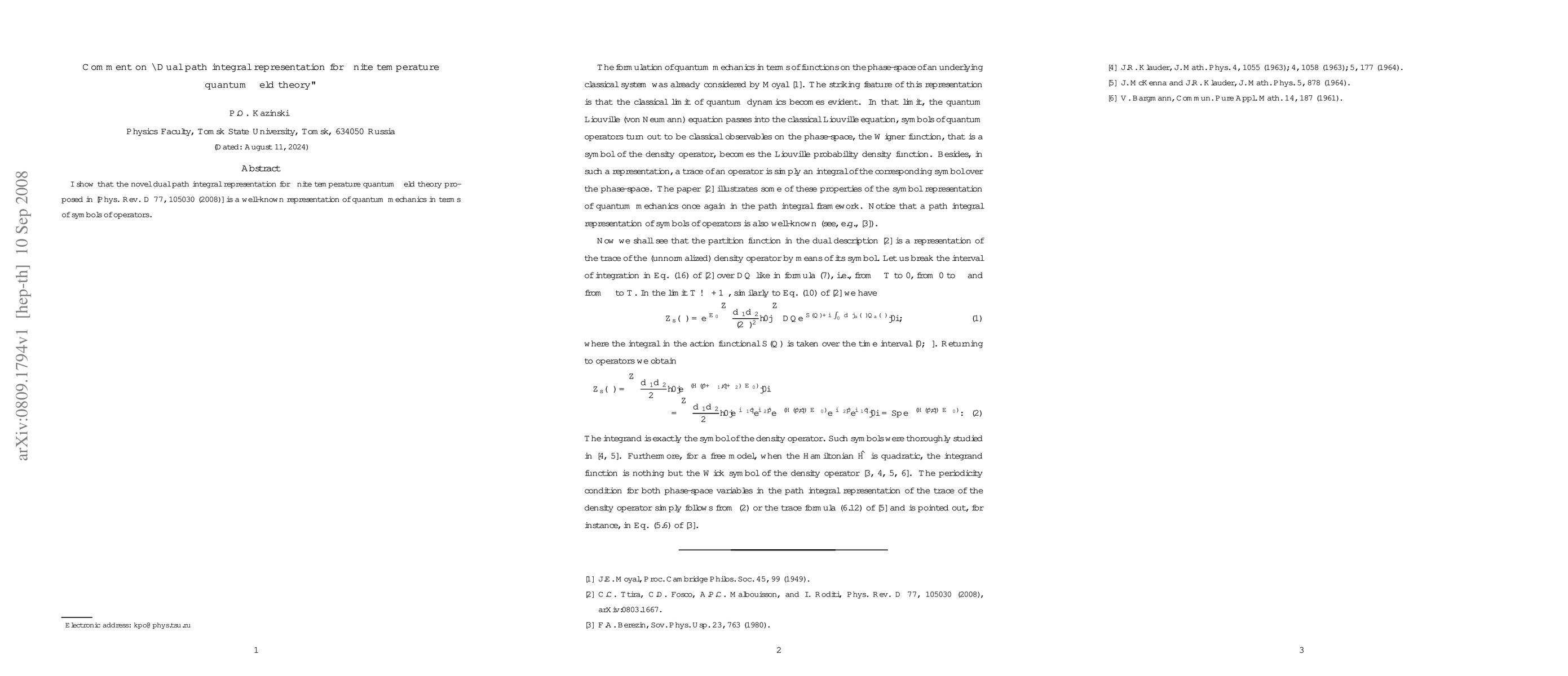 I show that the novel dual path integral representation for finite temperature quantum field theory proposed in [Phys. Rev. D 77, 105030 (2008), arXiv:0803.1667 ] is a well-known representation of quantum mechanics in terms of symbols of operators.