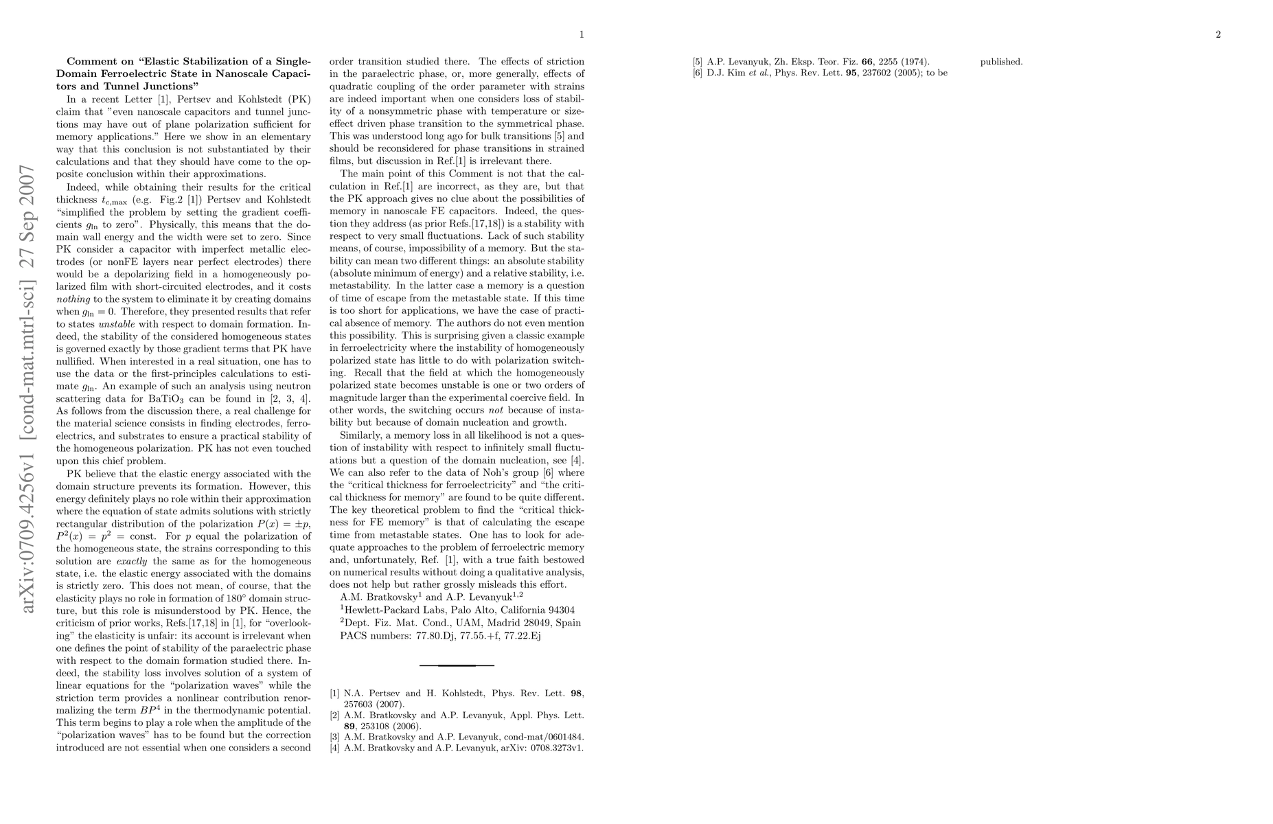 In a recent Letter [N.A. Pertsev and H. Kohlstedt, Phys. Rev. Lett. 98, 257603 (2007)] the authors claim that "even nanoscale capacitors and tunnel junctions may have out of plane polarization sufficient for memory applications." Here we show in an elementary way that this conclusion is not substantiated by their calculations and that they should have come to the opposite conclusion within their approximations.