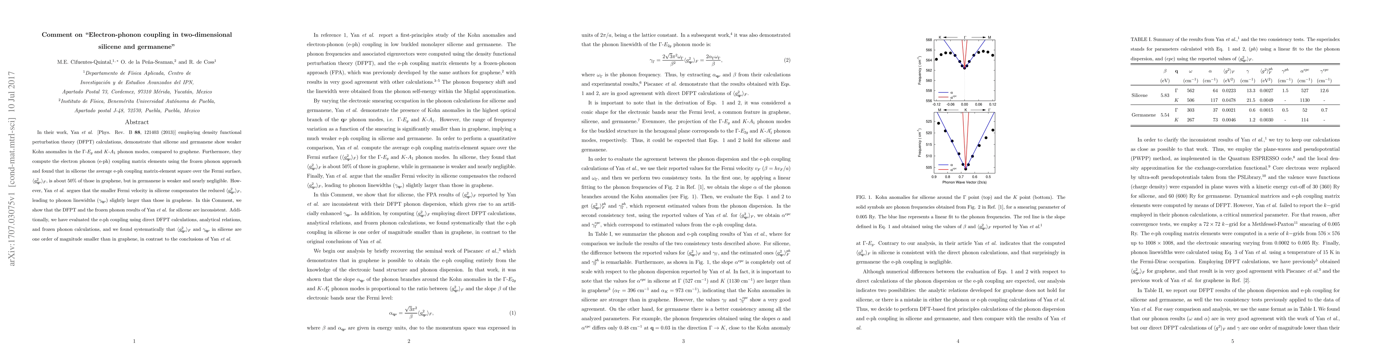 In their work, Yan et al. [Phys. Rev. B 88, 121403 (2013)] employing density functional perturbation theory (DFPT) calculations, demonstrate that silicene and germanene show weaker Kohn anomalies in the $\Gamma$-$E_g$ and $K$-$A_1$ phonon modes, compared to graphene. Furthermore, they compute the electron phonon (e-ph) coupling matrix elements using the frozen phonon approach and found that in silicene the average e-ph coupling matrix-element square over the Fermi surface, $\langle g_{{\bf q}\nu}^2\rangle_{F}$, is about 50 % of those in graphene, but in germanene is weaker and nearly negligible. However, Yan et al. argues that the smaller Fermi velocity in silicene compensates the reduced $\langle g_{{\bf q}\nu}^2\rangle_{F}$, leading to phonon linewidths ($\gamma_{{\bf q}\nu}$) slightly larger than those in graphene. In this Comment, we show that the DFPT and the frozen phonon results of Yan et al. for silicene are inconsistent. Additionally, we have evaluated the e-ph coupling using direct DFPT calculations, analytical relations, and frozen phonon calculations, and we found systematically that $\langle g_{{\bf q}\nu}^2\rangle_{F}$ and $\gamma_{{\bf q}\nu}$ in silicene are one order of magnitude smaller than in graphene, in contrast to the conclusions of Yan et al.