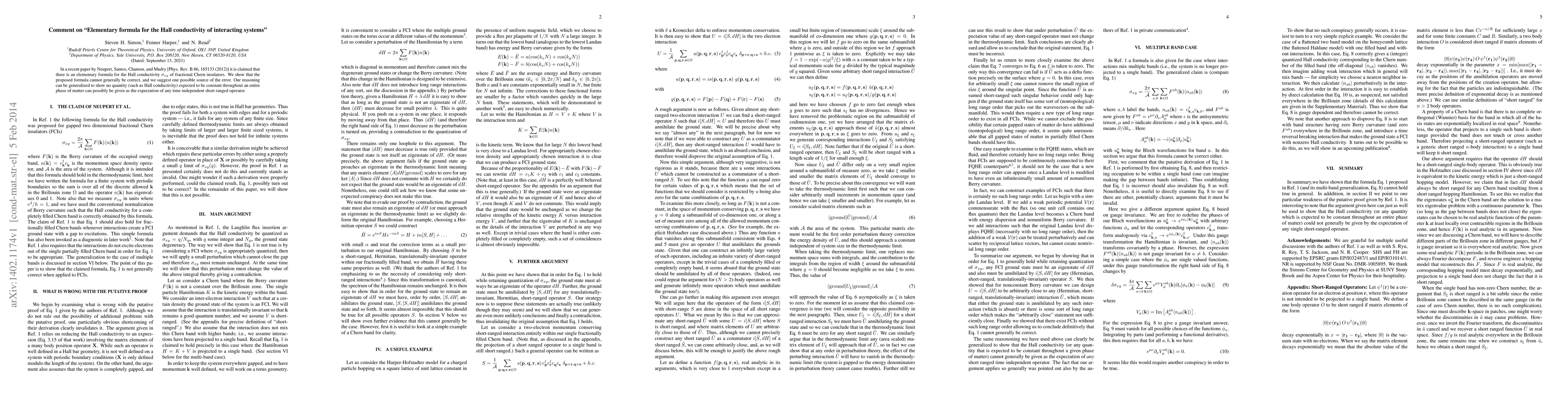 In a recent paper by Neupert, Santos, Chamon, and Mudry [Phys. Rev. B 86, 165133 (2012)] it is claimed that there is an elementary formula for the Hall conductivity of fractional Chern insulators. We show that the proposed formula cannot generally be correct, and we suggest one possible source of the error. Our reasoning can be generalized to show no quantity (such as Hall conductivity) expected to be constant throughout an entire phase of matter can possibly be given as the expectation of any time independent short ranged operator.