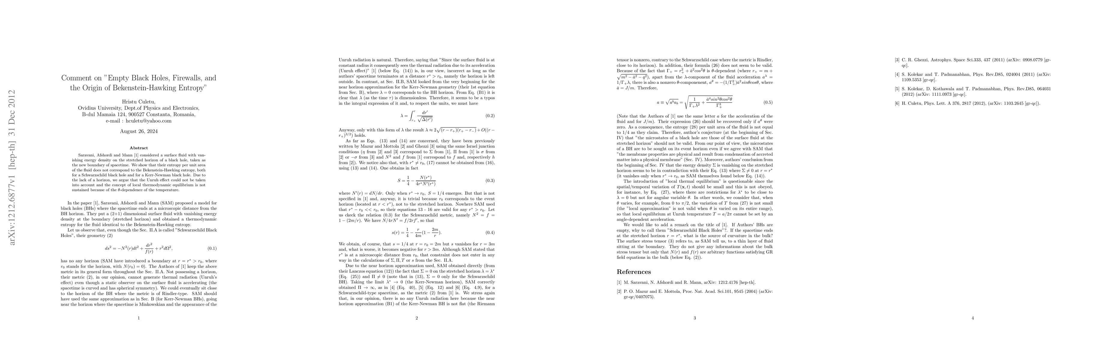 This paper critiques Saravani, Afshordi, and Mann's proposal of a surface fluid with zero energy density on a black hole's stretched horizon, arguing that their entropy per unit area does not equate to Bekenstein-Hawking entropy for Schwarzschild and Kerr-Newman black holes. It concludes that the absence of a horizon precludes the application of the Unruh effect and undermines local thermodynamic equilibrium due to temperature's $\theta$-dependence.