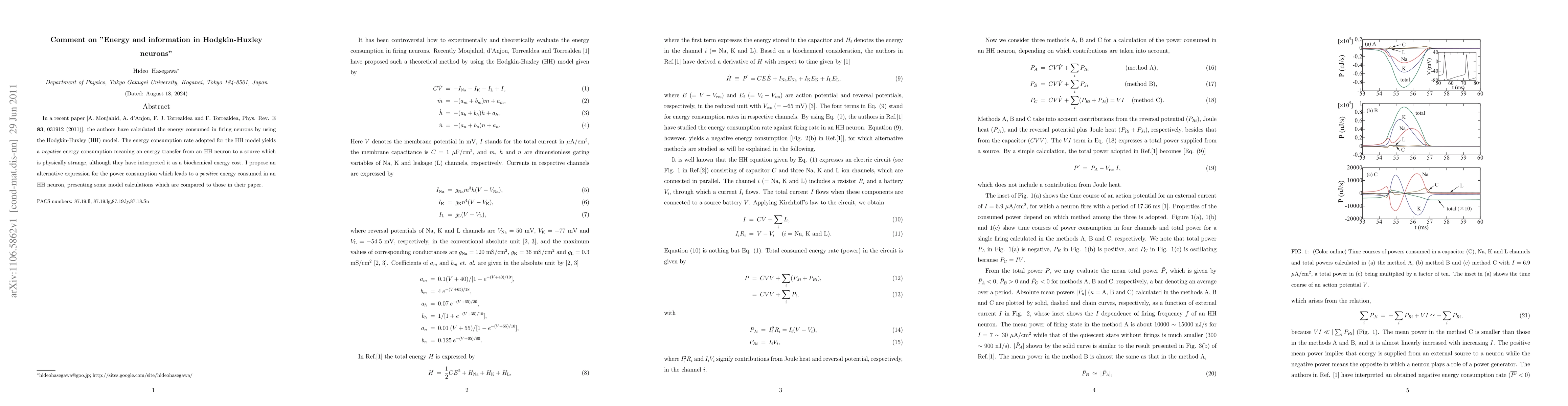 In a recent paper [A. Moujahid, A. d'Anjou, F. J. Torrealdea and F. Torrealdea, Phys. Rev. E {\bf 83}, 031912 (2011)], the authors have calculated the energy consumed in firing neurons by using the Hodgkin-Huxley (HH) model. The energy consumption rate adopted for the HH model yields a {\it negative} energy consumption meaning an energy transfer from an HH neuron to a source which is physically strange, although they have interpreted it as a biochemical energy cost. I propose an alternative expression for the power consumption which leads to a {\it positive} energy consumed in an HH neuron, presenting some model calculations which are compared to those in their paper.