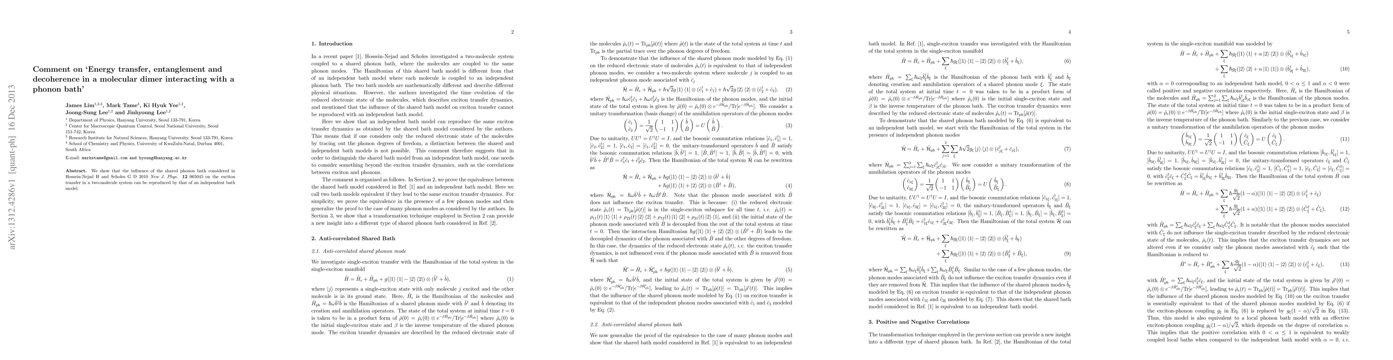 We show that the influence of the shared phonon bath considered in H. Hossein-Nejad and G. D. Scholes, New J. Phys. 12, 065045 (2010) on the exciton transfer in a two-molecule system can be reproduced by that of an independent bath model.