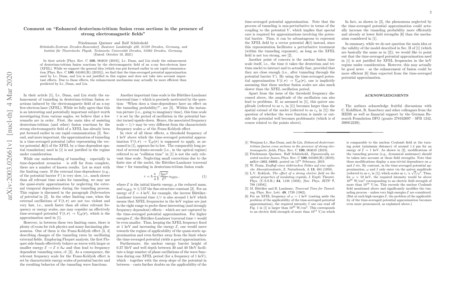 In their article [Phys.\ Rev.\ C {\bf 100}, 064610 (2019)], Lv, Duan, and Liu study the enhancement of deuterium-tritium fusion reactions by the electromagnetic field of an x-ray free-electron laser (XFEL). While we support the general idea (which was put forward earlier in our rapid communication [Phys.\ Rev.\ C {\bf 100}, 041601(R) (2019)]), we find that the time-averaged potential approximation used by Lv, Duan, and Liu is not justified in this regime and does not take into account important effects. Due to those effects, the enhancement mechanism may actually be more efficient than predicted by Lv, Duan, and Liu.