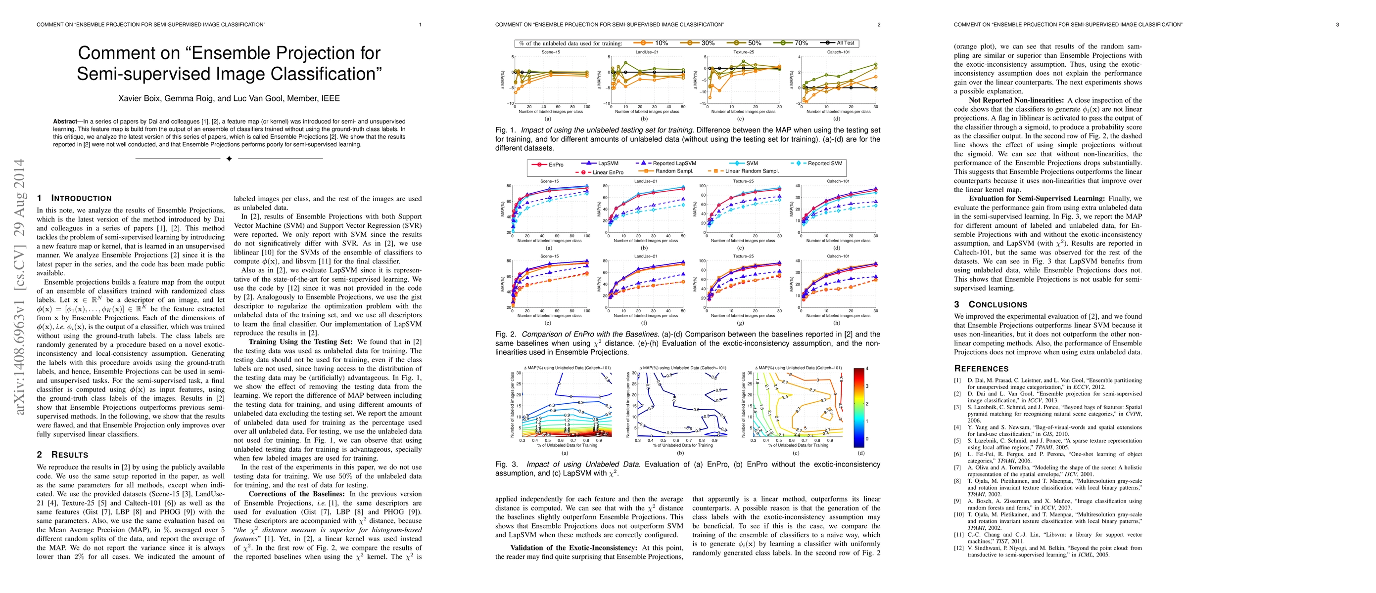 In a series of papers by Dai and colleagues [1,2], a feature map (or kernel) was introduced for semi- and unsupervised learning. This feature map is build from the output of an ensemble of classifiers trained without using the ground-truth class labels. In this critique, we analyze the latest version of this series of papers, which is called Ensemble Projections [2]. We show that the results reported in [2] were not well conducted, and that Ensemble Projections performs poorly for semi-supervised learning.
