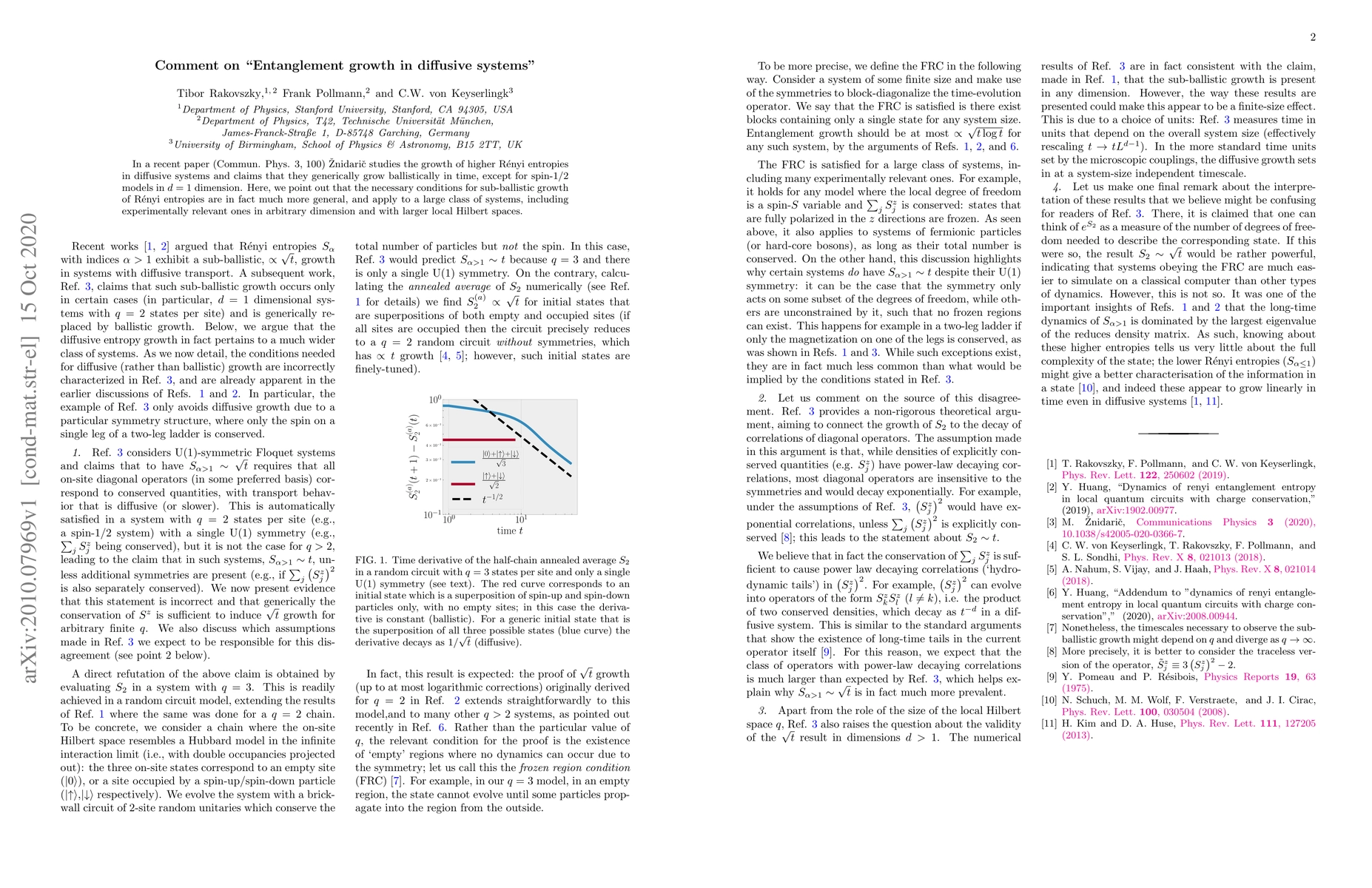 In a recent paper (Commun. Phys. 3, 100) Znidaric studies the growth of higher Renyi entropies in diffusive systems and claims that they generically grow ballistically in time, except for spin-1/2 models in d=1 dimension. Here, we point out that the necessary conditions for sub-ballistic growth of Renyi entropies are in fact much more general, and apply to a large class of systems, including experimentally relevant ones in arbitrary dimension and with larger local Hilbert spaces.