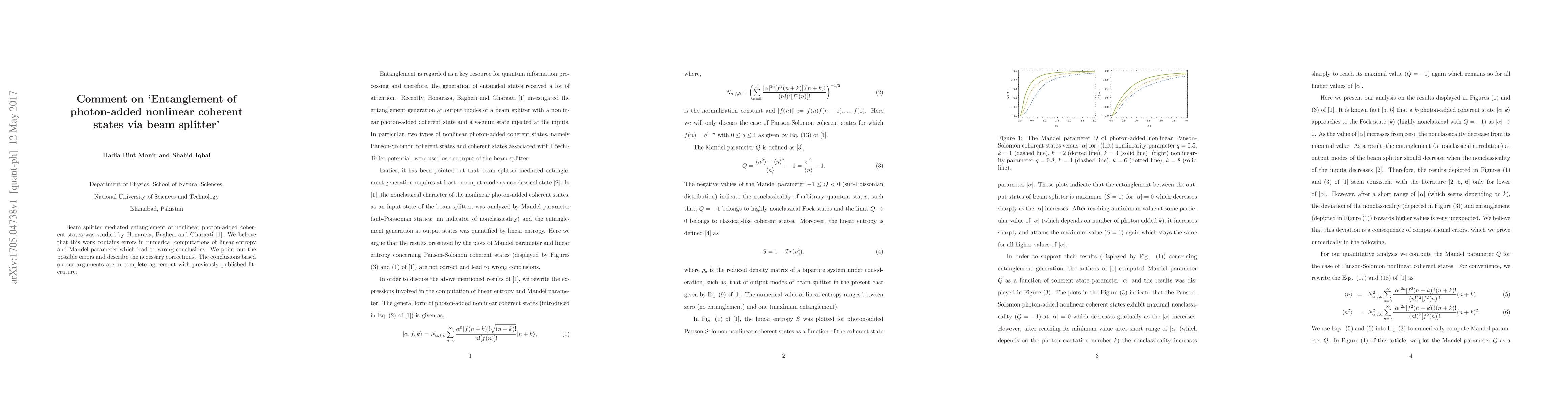 Beam splitter mediated entanglement of nonlinear photon-added coherent states was studied by Honarasa, Bagheri and Gharaati [1]. We believe that this work contains errors in numerical computations of linear entropy and Mandel parameter which lead to wrong conclusions. We point out the possible errors and describe the necessary corrections. The conclusions based on our arguments are in complete agreement with previously published literature.