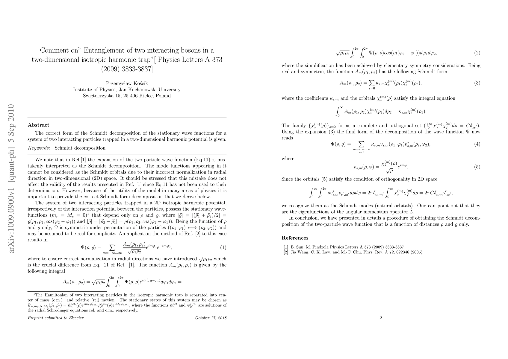 The correct form of the Schmidt decomposition of the stationary wave functions for a system of two interacting particles trapped in a two-dimensional harmonic potential is given