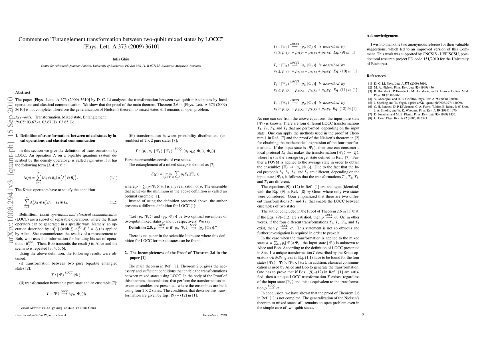 The paper [Phys. Lett. A 373 (2009) 3610] by D.-C. Li analyzes the transformation between two-qubit mixed states by local operations and classical communication. We show that the proof of the main theorem, Theorem 2.6 in [Phys. Lett. A 373 (2009) 3610] is not complete. Therefore the generalization of Nielsen's theorem to mixed states still remains an open problem.