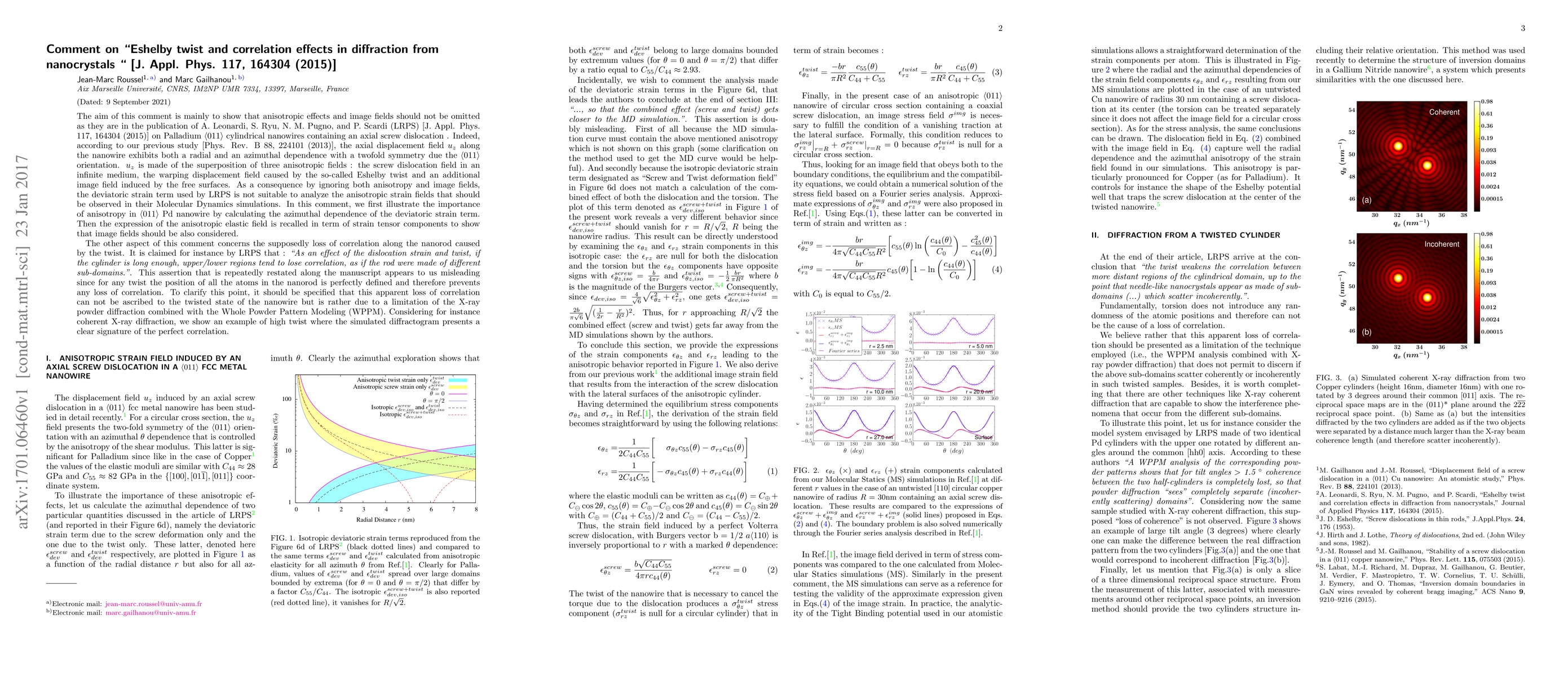 The aim of this comment is to show that anisotropic effects and image fields should not be omitted as they are in the publication of A. Leonardi, S. Ryu, N. M. Pugno, and P. Scardi (LRPS) [J. Appl. Phys. 117, 164304 (2015)] on Pd <011> cylindrical nanowires containing an axial screw dislocation. Indeed, according to our previous study [Phys. Rev. B 88, 224101 (2013)], the axial displacement field along the nanowire exhibits both a radial and an azimuthal dependence with a twofold symmetry due the <011> orientation. As a consequence, the deviatoric strain term used by LRPS is not suitable to analyze the anisotropic strain fields that should be observed in their atomistic simulations. In this comment, we first illustrate the importance of anisotropy in <011> Pd nanowire by calculating the azimuthal dependence of the deviatoric strain term. Then the expression of the anisotropic elastic field is recalled in term of strain tensor components to show that image fields should be also considered. The other aspect of this comment concerns the supposedly loss of correlation along the nanorod caused by the twist. It is claimed for instance by LRPS that : "As an effect of the dislocation strain and twist, if the cylinder is long enough, upper/lower regions tend to lose correlation, as if the rod were made of different sub-domains.". This assertion appears to us misleading since for any twist the position of all the atoms in the nanorod is perfectly defined and therefore prevents any loss of correlation. To clarify this point, it should be specified that this apparent loss of correlation can not be ascribed to the twisted state of the nanowire but is rather due to a limitation of the X-ray powder diffraction. Considering for instance coherent X-ray diffraction, we show an example of high twist where the simulated diffractogram presents a clear signature of the perfect correlation.