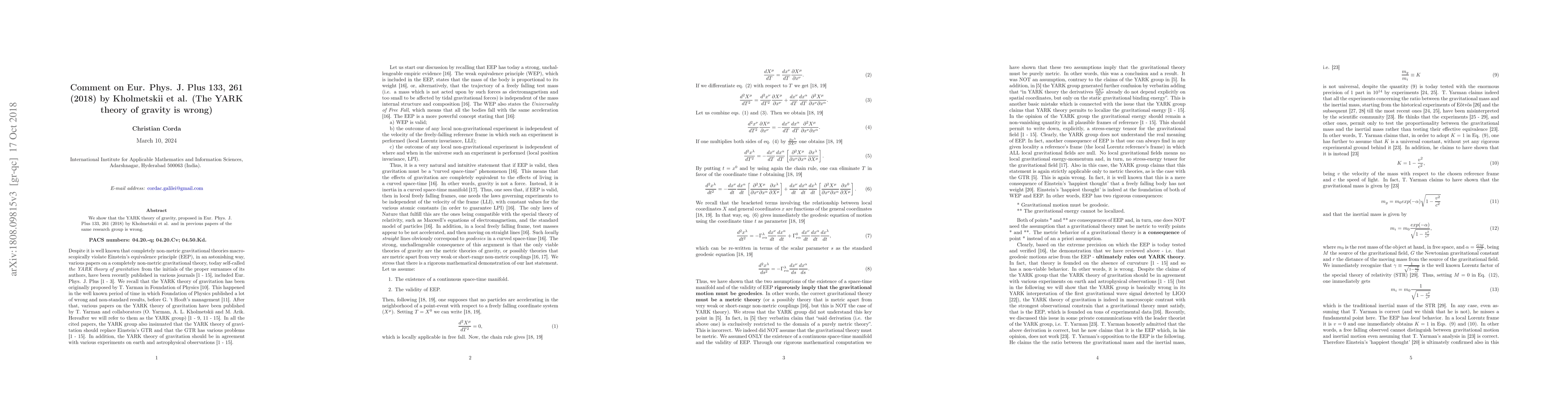 Researchers disagree with the YARK theory of gravity, stating it is incorrect, and provide evidence to support their claim.