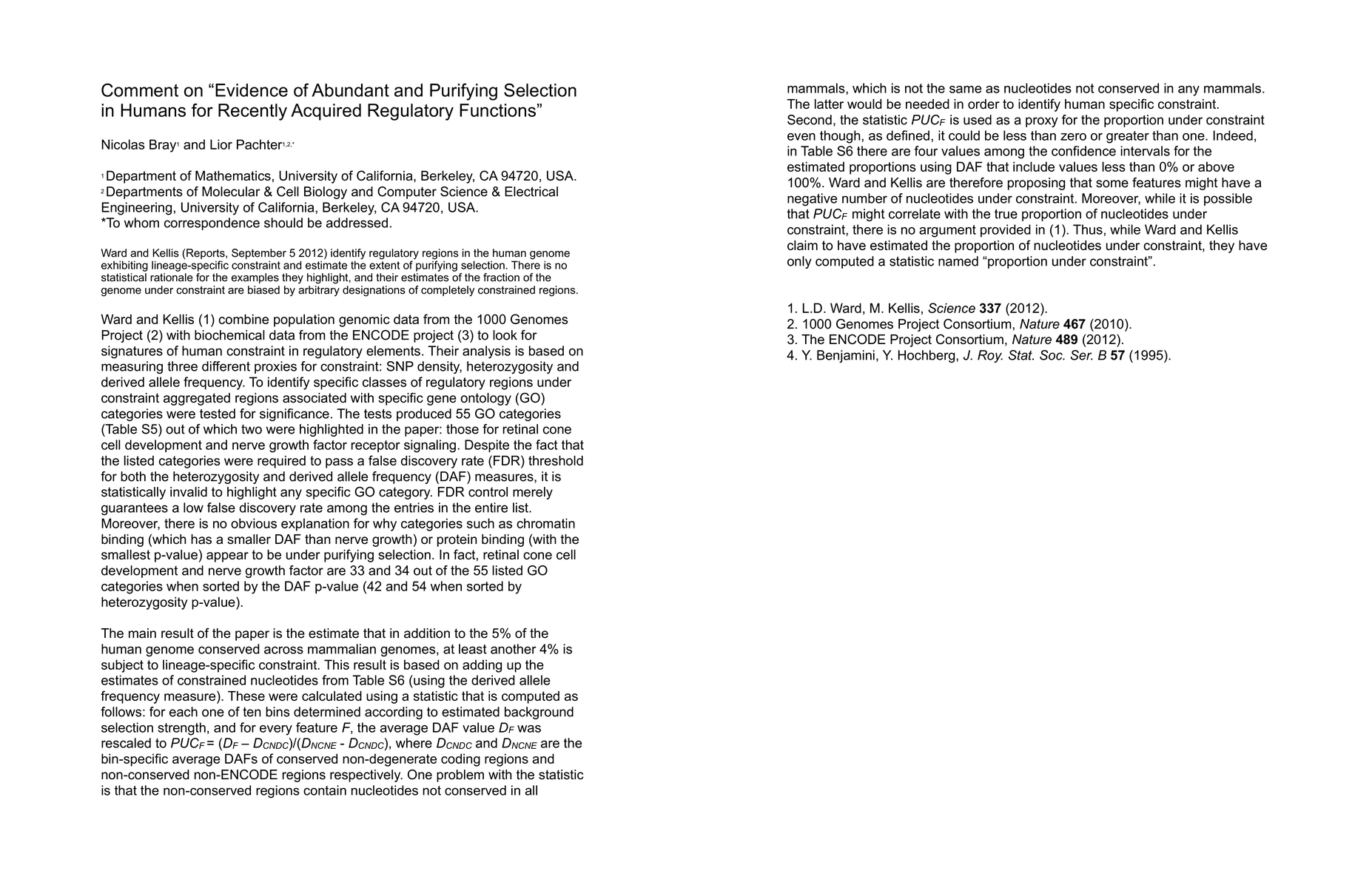 Ward and Kellis (Reports, September 5 2012) identify regulatory regions in the human genome exhibiting lineage-specific constraint and estimate the extent of purifying selection. There is no statistical rationale for the examples they highlight, and their estimates of the fraction of the genome under constraint are biased by arbitrary designations of completely constrained regions.
