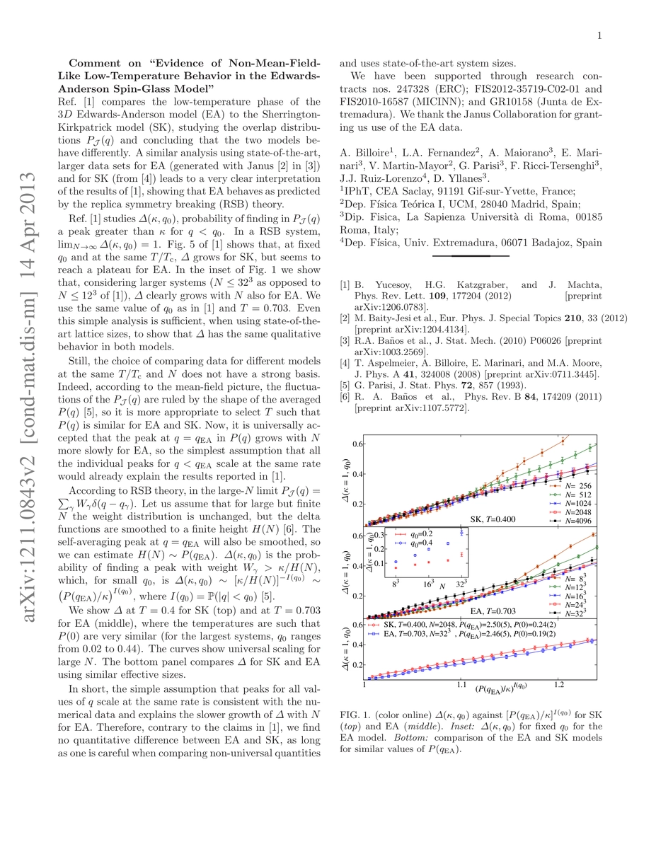 A recent interesting paper [Yucesoy et al. Phys. Rev. Lett. 109, 177204 (2012), arXiv:1206:0783] compares the low-temperature phase of the 3D Edwards-Anderson (EA) model to its mean-field counterpart, the Sherrington-Kirkpatrick (SK) model. The authors study the overlap distributions P_J(q) and conclude that the two models behave differently. Here we notice that a similar analysis using state-of-the-art, larger data sets for the EA model (generated with the Janus computer) leads to a very clear interpretation of the results of Yucesoy et al., showing that the EA model behaves as predicted by the replica symmetry breaking (RSB) theory.