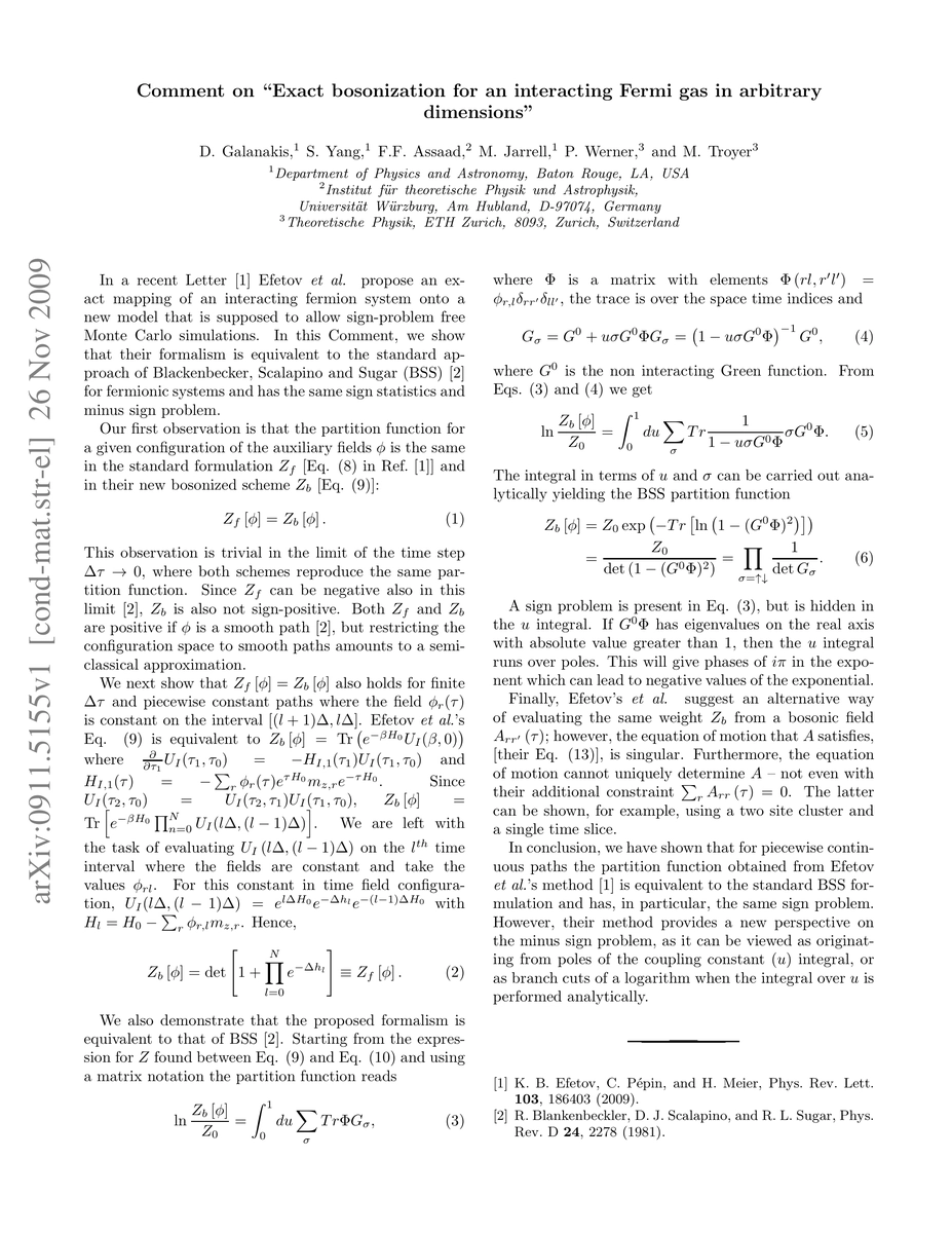 This a comment on arXiv:0907.3243v2. We demonstrate that the method proposed by Efetov {\it et. al.} is just a reformulation of the Blankenbeckler, Scalapino, and Sugar approach and thus it contains exactly the same sign problem, including the dependence of the sign on the smoothness of the paths.
