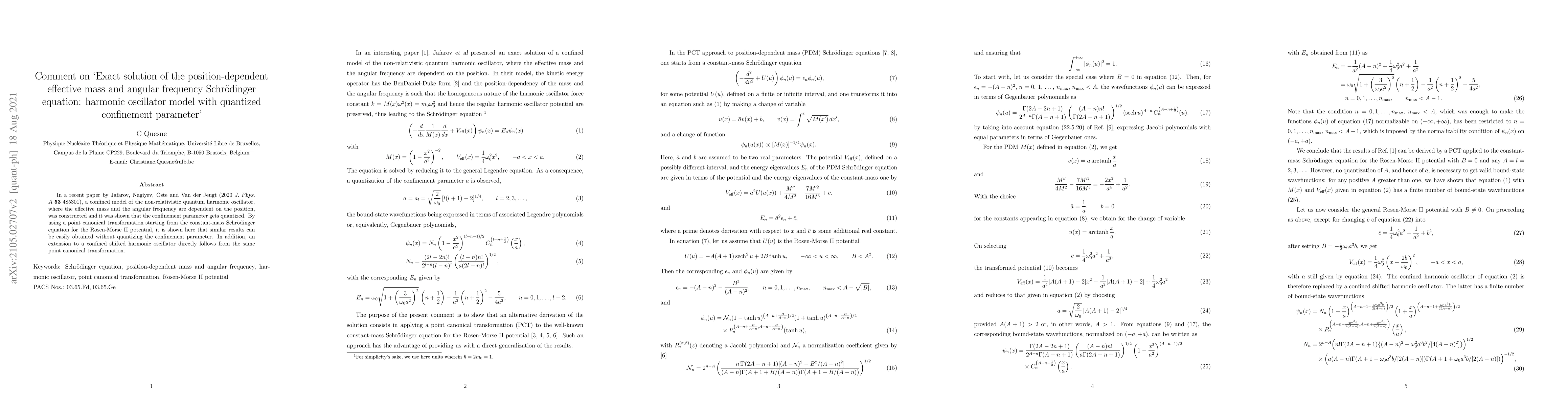 This paper critiques Jafarov et al.'s (2020) model of a position-dependent effective mass and angular frequency quantum harmonic oscillator, demonstrating that similar results can be derived without quantizing the confinement parameter using a point canonical transformation. An extension to a confined shifted harmonic oscillator is also presented.