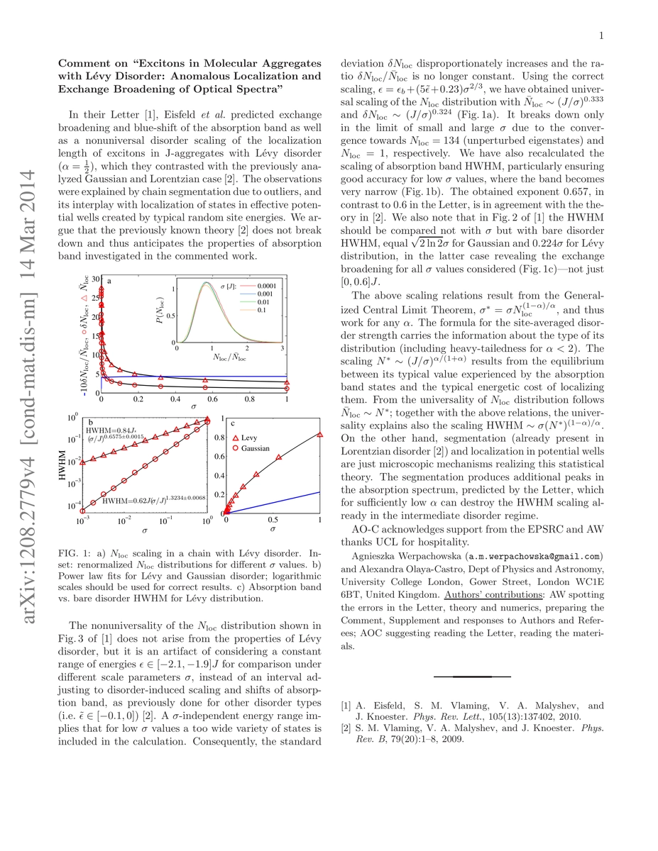 In their Letter [Phys. Rev. Lett. 105, 137402 (2010)], Eisfeld et al. predicted the exchange broadening and blue-shift of the absorption band as well as a nonuniversal disorder scaling of the localization length of excitons in J-aggregates with Levy disorder, which they contrasted with the previously analyzed Gaussian and Lorentzian case [Phys. Rev. B, 79, 1 (2009)]. The observations were explained by chain segmentation due to outliers, and its interplay with localization of states in effective potential wells created by typical random site energies. We argue that the previously known theory does not break down and thus anticipates the properties of absorption band investigated in the commented work.