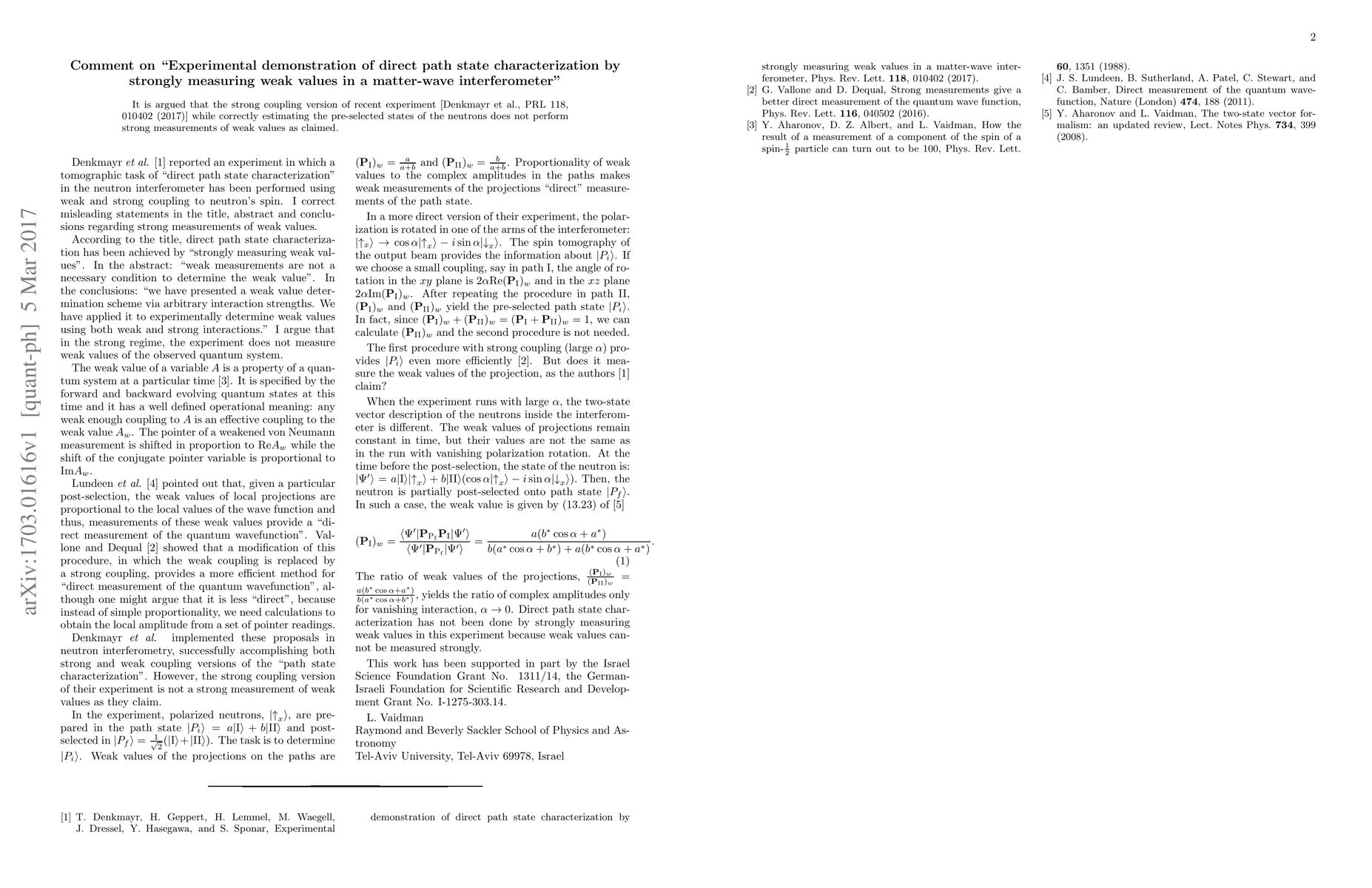 It is argued that the strong coupling version of recent experiment [Denkmayr et al., PRL 118, 010402 (2017)] while correctly estimating the pre-selected states of the neutrons does not perform strong measurements of weak values as claimed.
