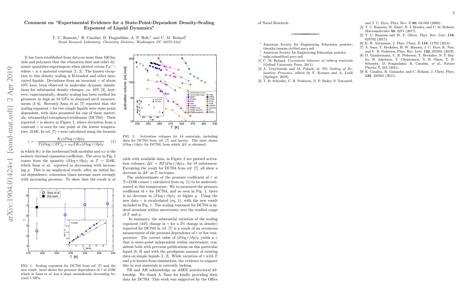 Recently Sanz et al. [A. Sanz, T. Hecksher, H.W. Hansen, J.C. Dyre, K. Niss, and U.R. Pedersen, Phys. Rev. Lett. 122, 055501 (2019).] reported that the scaling exponent gamma for tetramethyl-tetraphenyl-trisiloxane (DC704) varied with temperature; i.e., was not a material constant. Such a finding is at odds with previously published results on this compound and on more than 100 other liquids and polymers. The result of Sanz et al. comes from their measurement of a pressure dependence of the relaxation time at low temperature that becomes weaker with increasing pressure. Such a result is unphysical and contrary to the behavior of all known liquids. We re-measured this pressure dependence for DC704 and find it to be linear over the studied range. Thus, the conclusion of Sans et al. is incorrect; gamma for DC704 is state-point independent, in accord with other simple liquids and polymers.