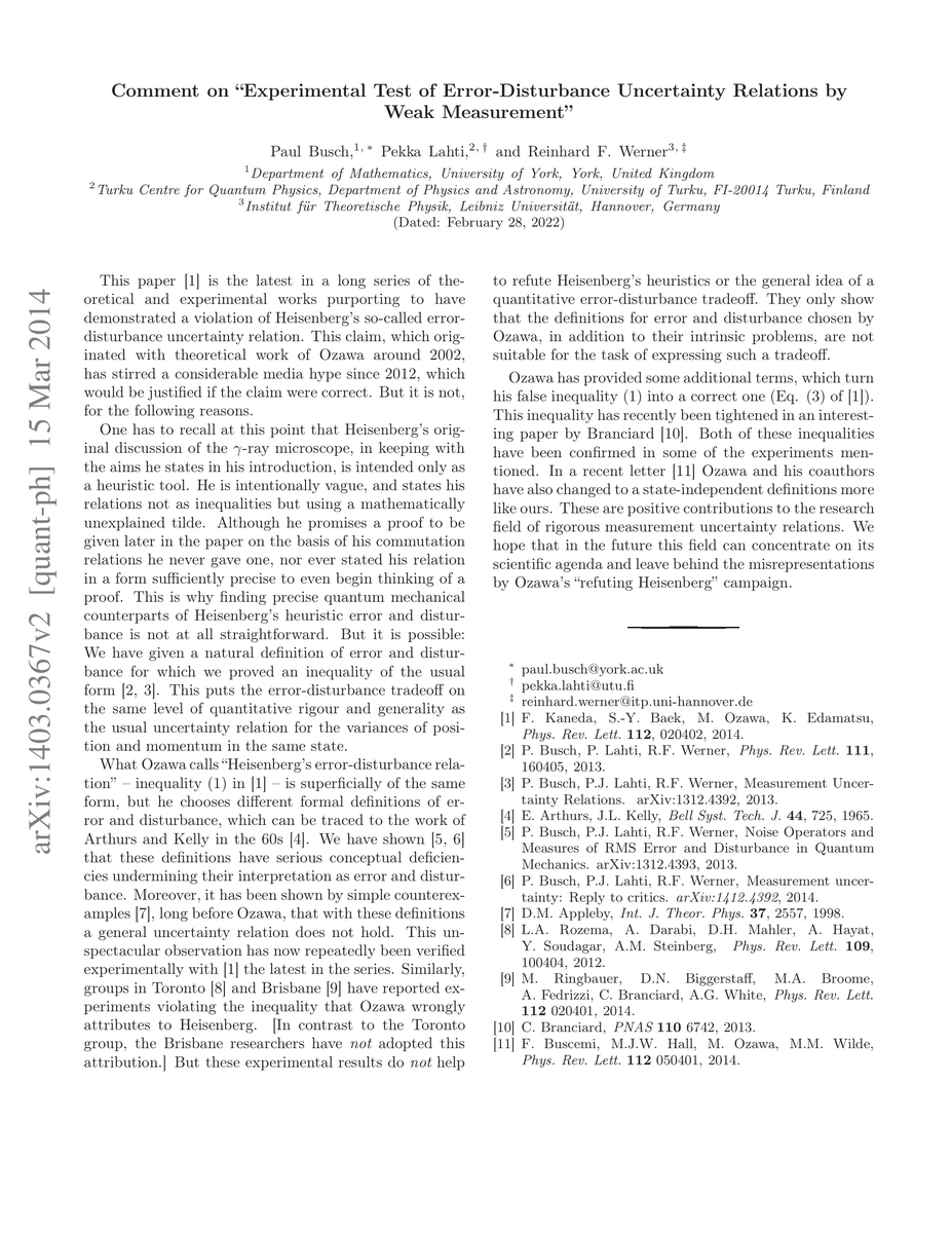 In this comment on the paper by F. Kaneda, S.-Y. Baek, M. Ozawa and K. Edamatsu [Phys. Rev. Lett. 112, 020402, 2014, arXiv:1308.5868], we point out that the claim of having refuted Heisenberg's error-disturbance relation is unfounded since it is based on the choice of unsuitable and operationally problematical quantifications of measurement error and disturbance. As we have shown elsewhere [PRL 111, 160405, 2013], for appropriate choices of operational measures of error and disturbance, Heisenberg's heuristic relation can be turned into a precise inequality which is a rigorous consequence of quantum mechanics.