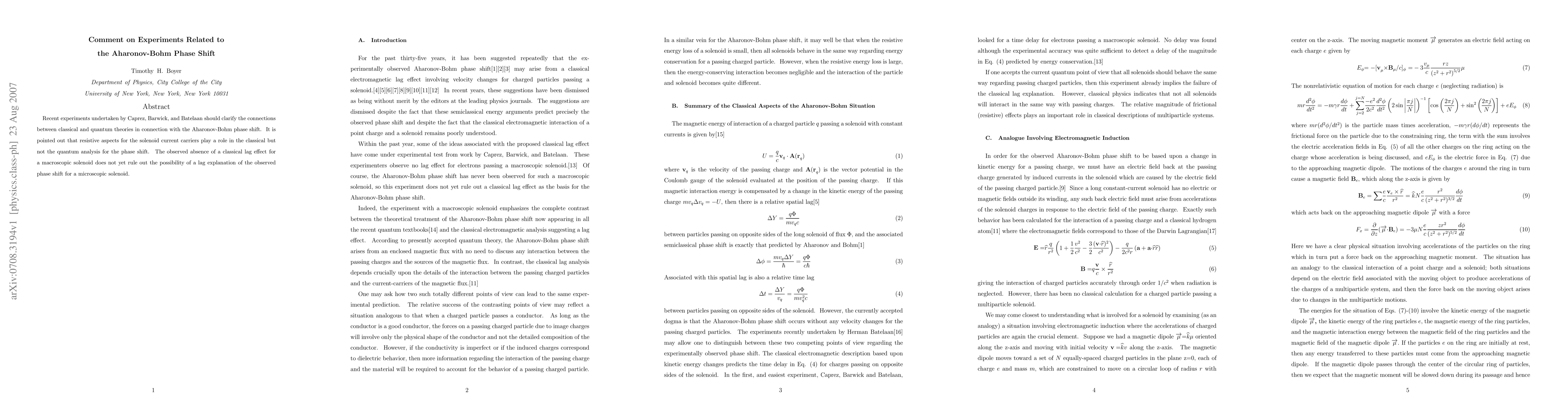 This paper discusses recent experiments by Caprez, Barwick, and Batelaan that aim to clarify the relationship between classical and quantum theories regarding the Aharonov-Bohm phase shift, noting the importance of resistive aspects in classical analysis that are absent in quantum analysis. It suggests that while no classical lag effect is observed for macroscopic solenoids, microscopic ones may still exhibit such effects.