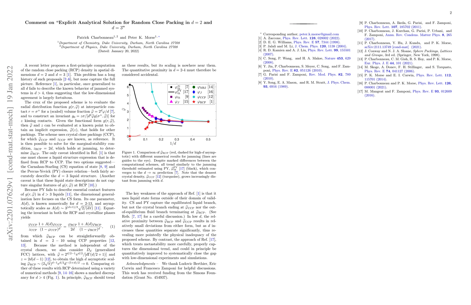 Summary: The paper critiques a recent proposal for an analytical solution to random close packing density in 2D and 3D, arguing that while it works in lower dimensions, it fails to generalize to higher dimensions and thus does not provide a comprehensive understanding of jammed systems.