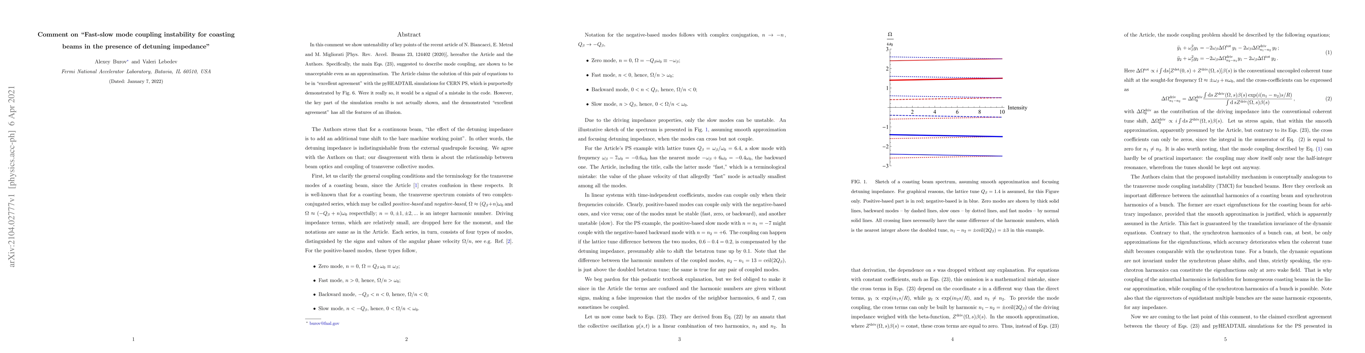 In this comment we show untenability of key points of the recent article of N. Biancacci, E. Metral and M. Migliorati [Phys. Rev. Accel. Beams 23, 124402 (2020)], hereafter the Article and the Authors. Specifically, the main Eqs. (23), suggested to describe mode coupling, are shown to be unacceptable even as an approximation. The Article claims the solution of this pair of equations to be in "excellent agreement" with the pyHEADTAIL simulations for CERN PS, which is purportedly demonstrated by Fig. 6. Were it really so, it would be a signal of a mistake in the code. However, the key part of the simulation results is not actually shown, and the demonstrated agreement has all the features of an illusion.