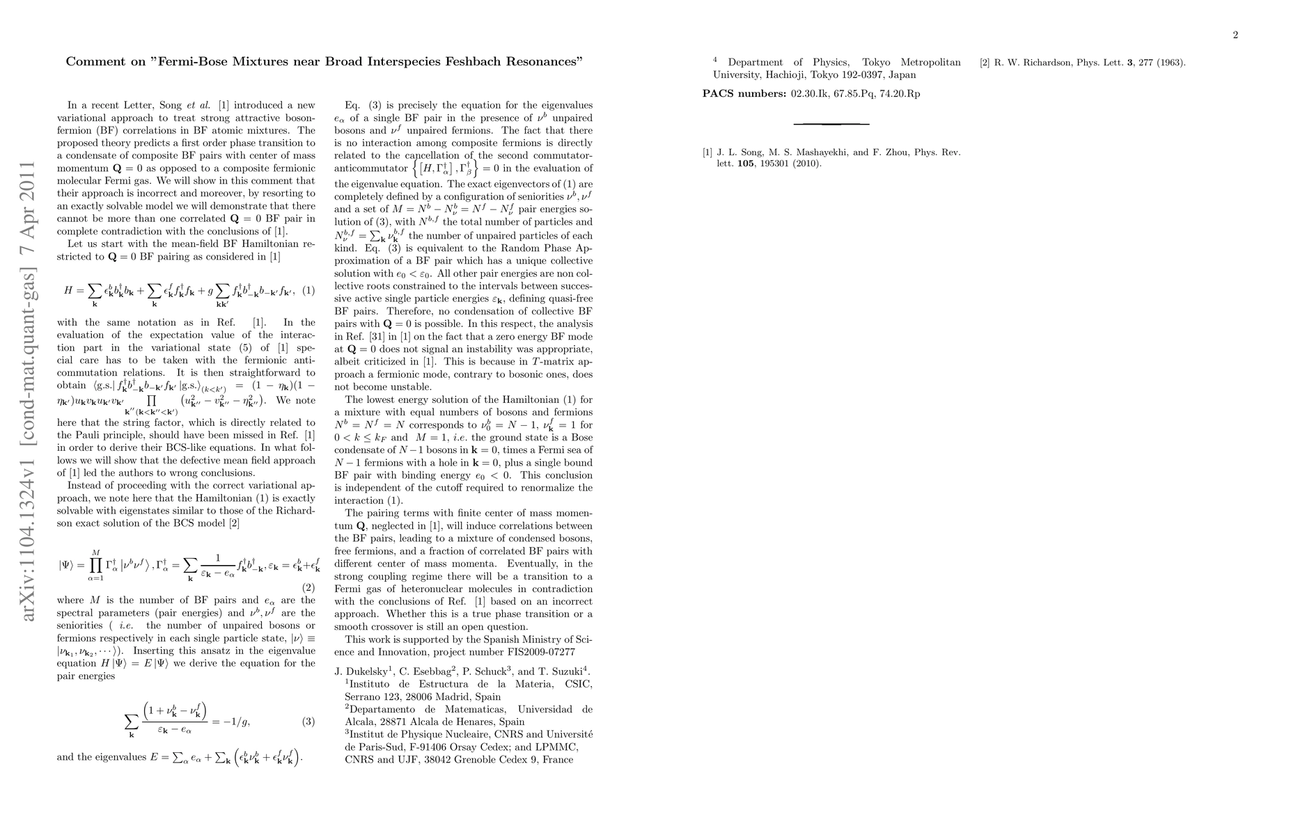 Researchers challenge a new theory on boson-fermion mixtures, finding that it predicts an incorrect number of correlated particles; the original study's results are contradicted with an exactly solvable model.