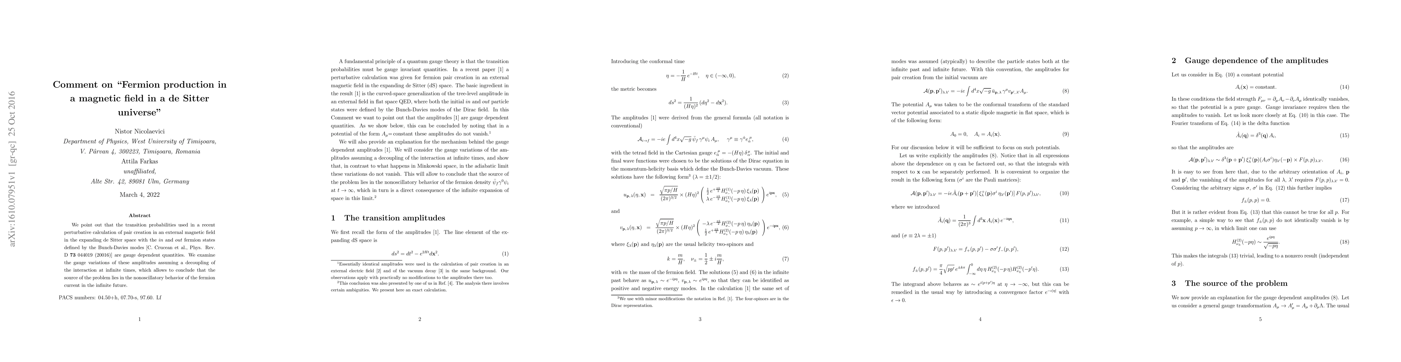 A recent study on pair creation in a de Sitter universe with an external magnetic field found that transition probabilities were gauge-dependent quantities. This was due to the non-oscillatory behavior of fermion currents, which led to incorrect results.