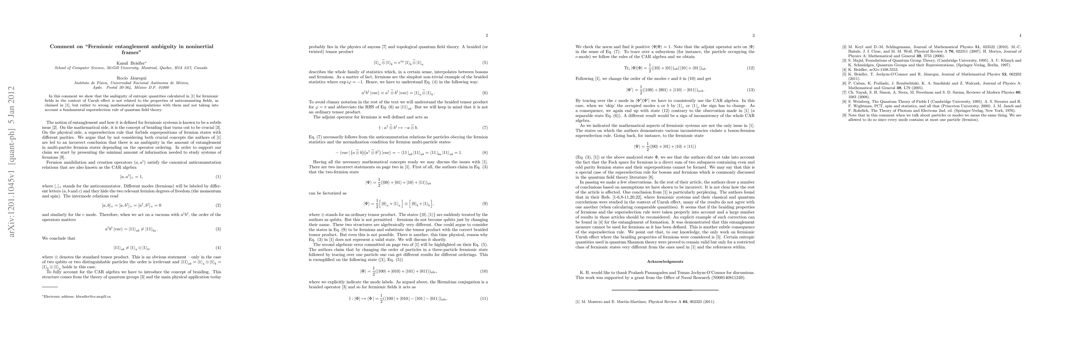 This comment clarifies that the entropic ambiguity in fermionic fields under the Unruh effect, previously attributed to the nature of anticommuting fields, actually stems from incorrect mathematical manipulations and neglect of a key quantum field theory superselection rule.