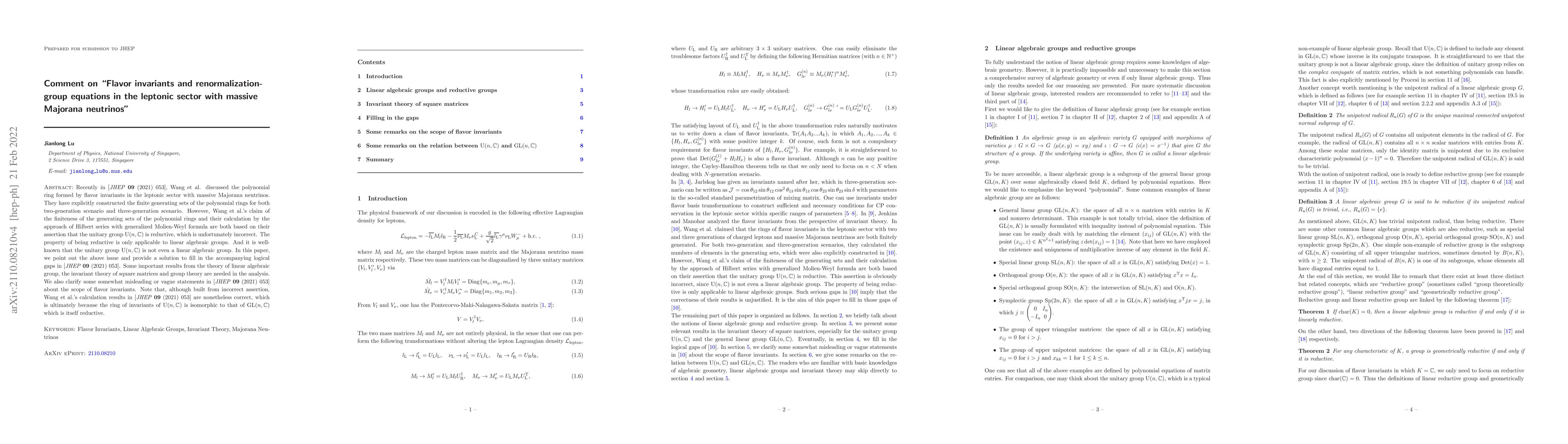 Recently in [JHEP 09 (2021) 053], Wang et al. discussed the polynomial ring formed by flavor invariants in the leptonic sector with massive Majorana neutrinos. They have explicitly constructed the finite generating sets of the polynomial rings for both two-generation scenario and three-generation scenario. However, Wang et al.'s claim of the finiteness of the generating sets of the polynomial rings and their calculation by the approach of Hilbert series with generalized Molien-Weyl formula are both based on their assertion that the unitary group ${\rm U}(n,\mathbb{C})$ is reductive, which is unfortunately incorrect. The property of being reductive is only applicable to linear algebraic groups. And it is well-known that the unitary group ${\rm U}(n,\mathbb{C})$ is not even a linear algebraic group. In this paper, we point out the above issue and provide a solution to fill in the accompanying logical gaps in [JHEP 09 (2021) 053]. Some important results from the theory of linear algebraic group, the invariant theory of square matrices and group theory are needed in the analysis. We also clarify some somewhat misleading or vague statements in [JHEP 09 (2021) 053] about the scope of flavor invariants. Note that, although built from incorrect assertion, Wang et al.'s calculation results in [JHEP 09 (2021) 053] are nonetheless correct, which is ultimately because the ring of invariants of ${\rm U}(n,\mathbb{C})$ is isomorphic to that of ${\rm GL}(n,\mathbb{C})$ which is itself reductive.