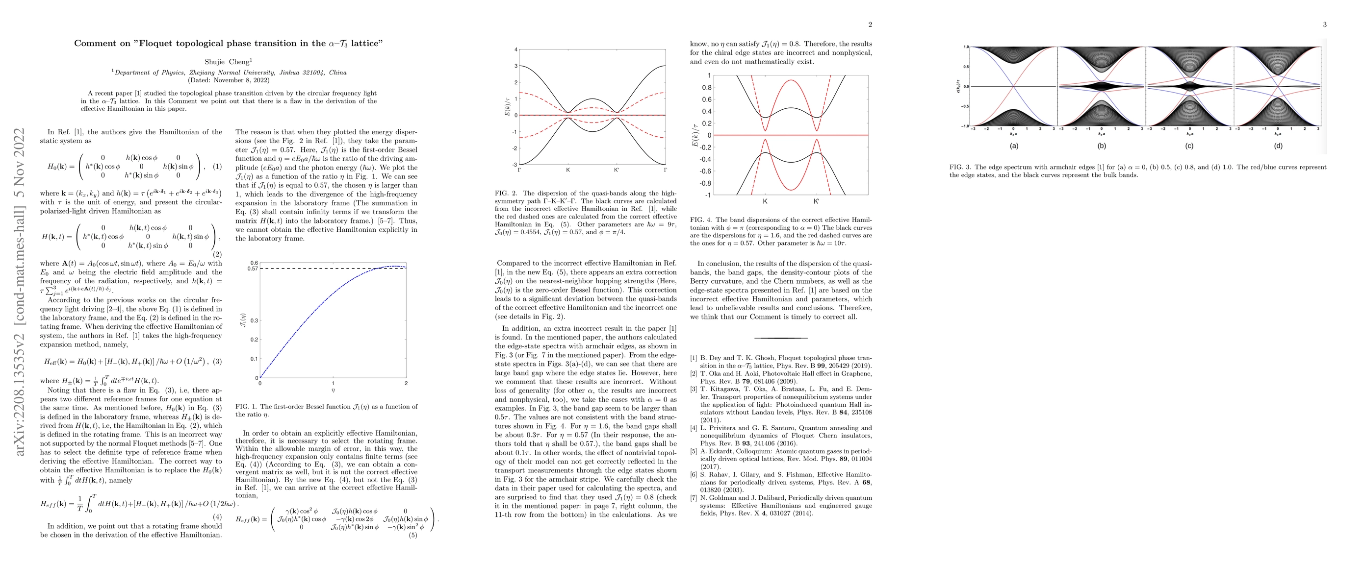 A recent paper studied the topological phase transition driven by the circular frequency light in the $\alpha$--$\mathcal{T}_{3}$ lattice. In this Comment we point out that there is a flaw in the derivation of the effective Hamiltonian in this paper.
