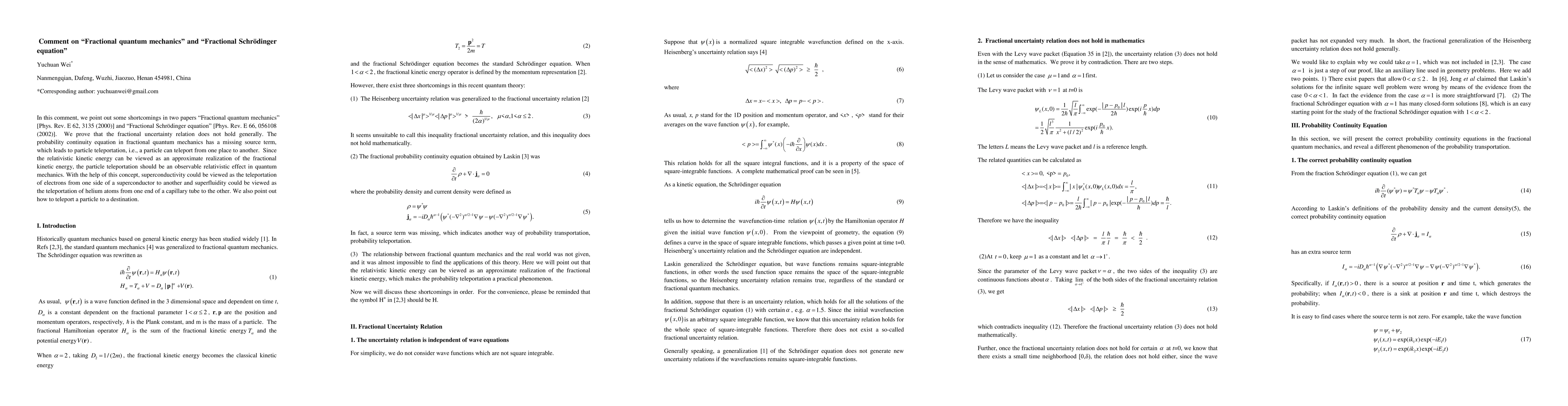 In this comment, we point out some shortcomings in two papers "Fractional quantum mechanics" [Phys. Rev. E 62, 3135 (2000)] and "Fractional Schroedinger equation" [Phys. Rev. E 66, 056108 (2002)]. We prove that the fractional uncertainty relation does not hold generally. The probability continuity equation in fractional quantum mechanics has a missing source term, which leads to particle teleportation, i.e., a particle can teleport from one place to another. Since the relativistic kinetic energy can be viewed as an approximate realization of the fractional kinetic energy, the particle teleportation should be an observable relativistic effect in quantum mechanics. With the help of this concept, superconductivity could be viewed as the teleportation of electrons from one side of a superconductor to another and superfluidity could be viewed as the teleportation of helium atoms from one end of a capillary tube to the other. We also point out how to teleport a particle to a destination.