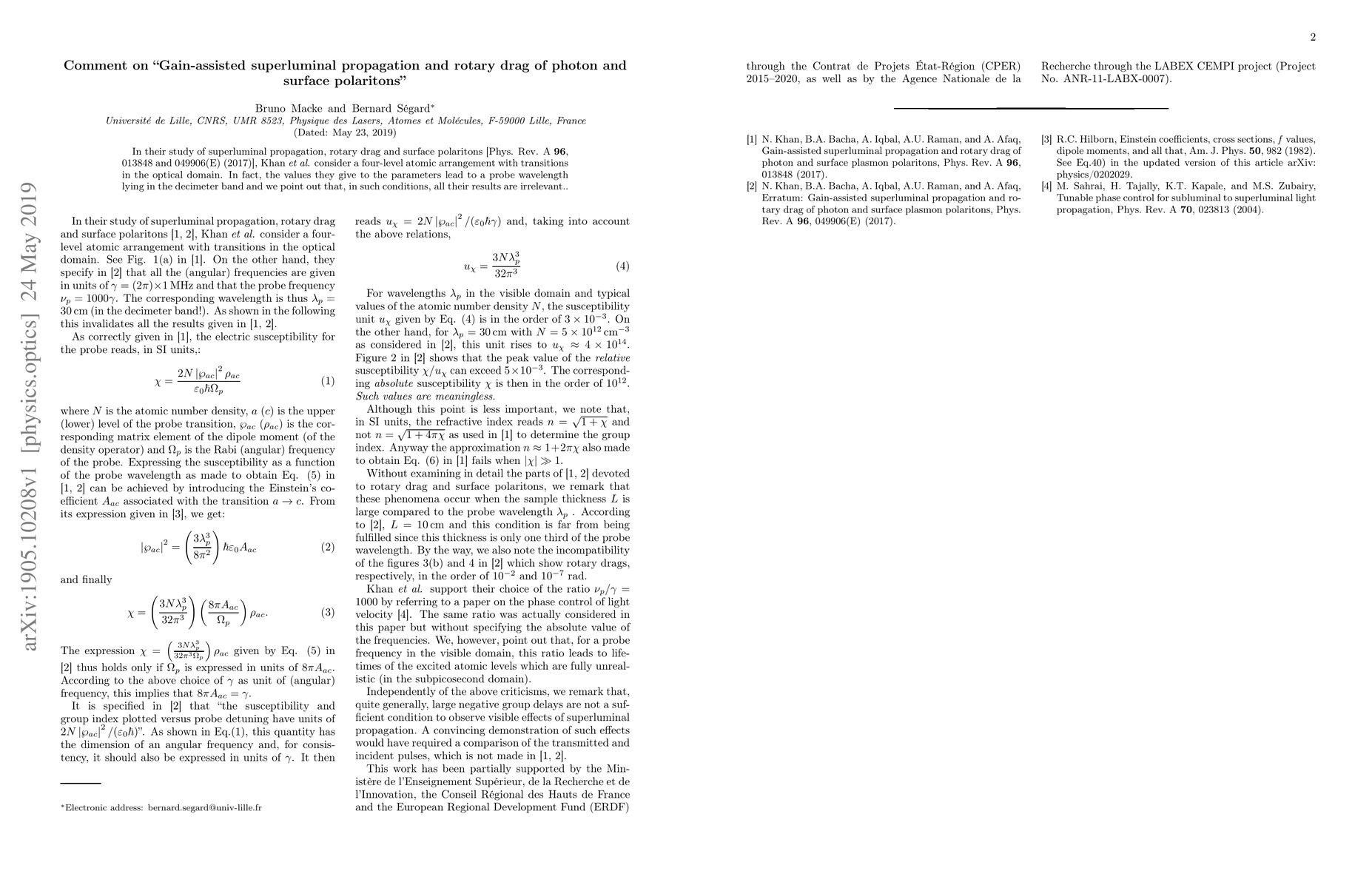 In their study of superluminal propagation, rotary drag and surface polaritons [Phys. Rev. A 96, 013848 and 049906(E) (2017)], Khan et al. consider a four-level atomic arrangement with transitions in the optical domain. In fact, the values they give to the parameters lead to a probe wavelength lying in the decimeter band and we point out that, in such conditions, all their results are irrelevant.